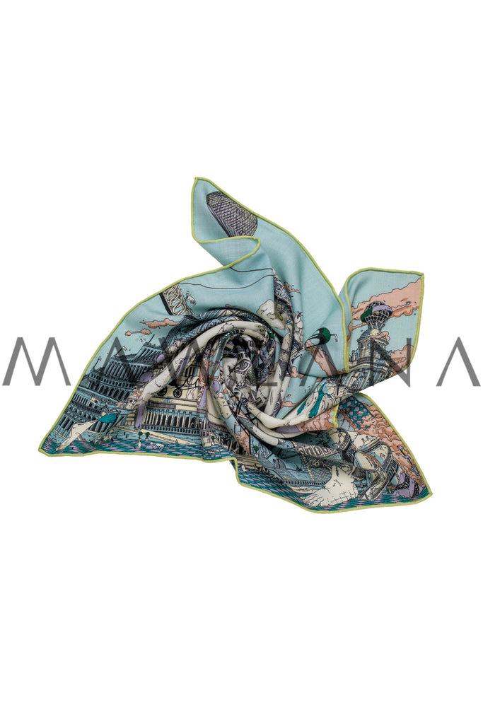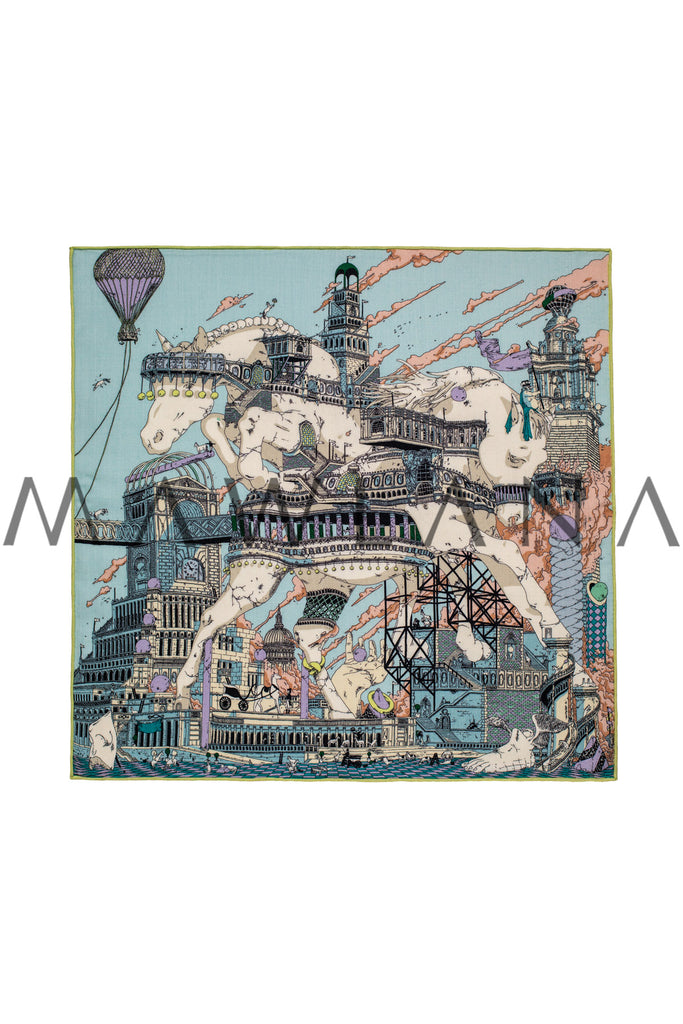 Unleash your imagination with this surreal and captivating scarf that merges classical architecture with dreamlike elements. A majestic white horse, adorned with entire buildings, gallops across a sky filled with floating towers, domes, and hot-air balloons. Set against a soft aqua blue background, the scarf is a true artistic statement.