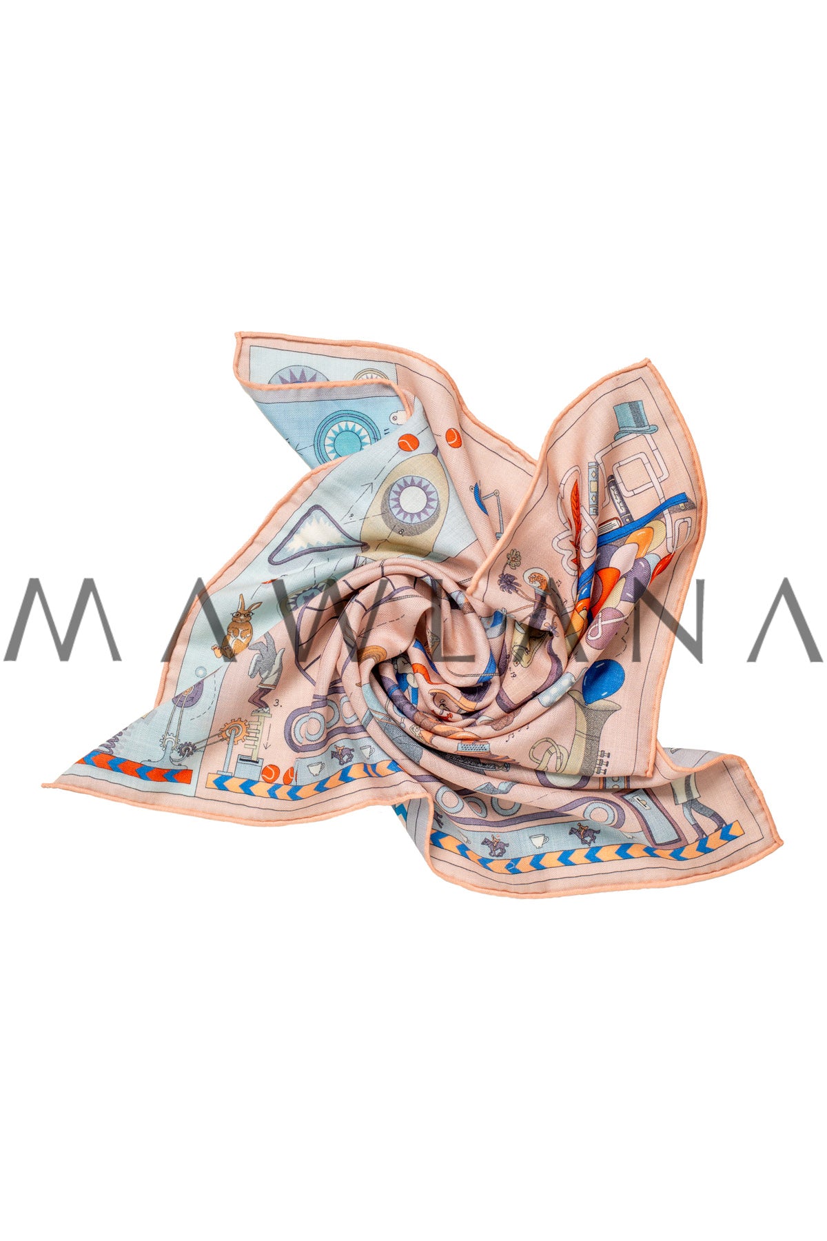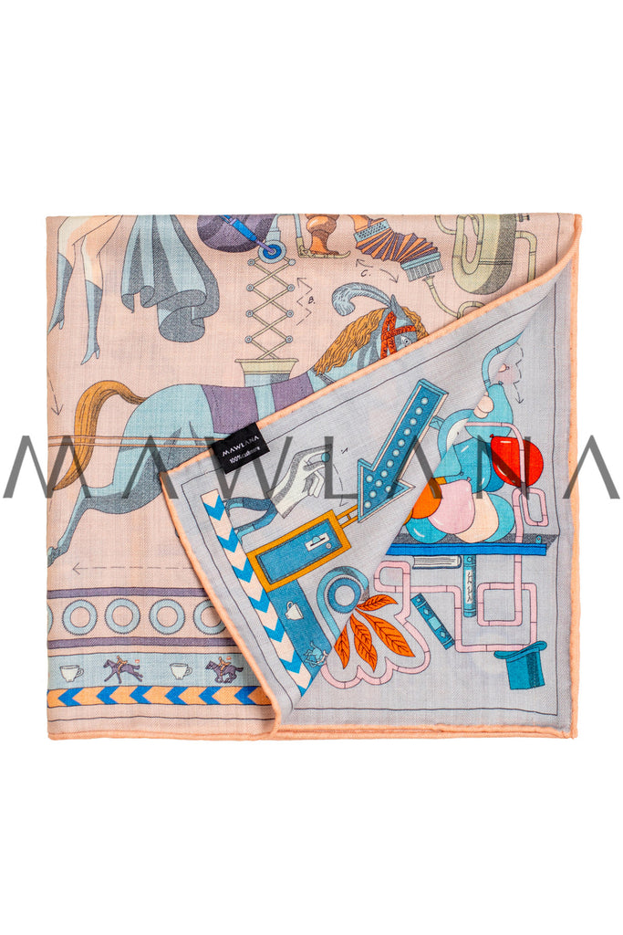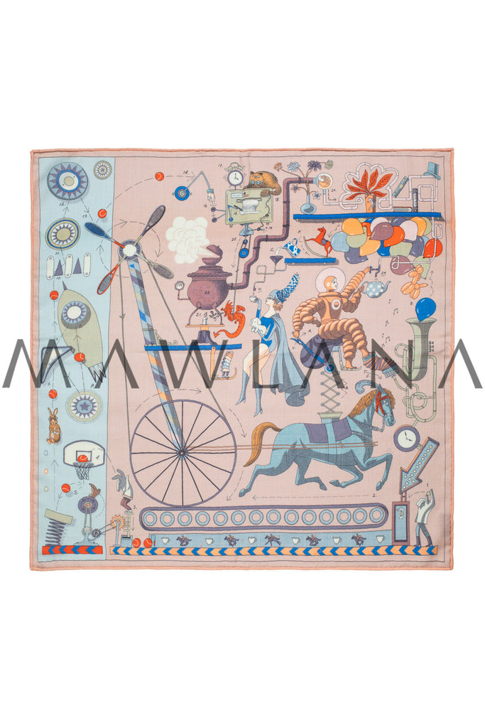 Imaginative and full of charm, this scarf takes you into a whimsical world of invention and movement. Featuring a delightful scene of gears, propellers, balloons, horses, and curious characters, it resembles a playful blueprint of a fantastical machine. Set against a soft blush background with accents of pastel blue, orange, and lavender.