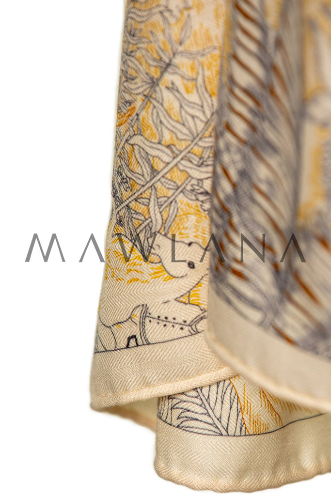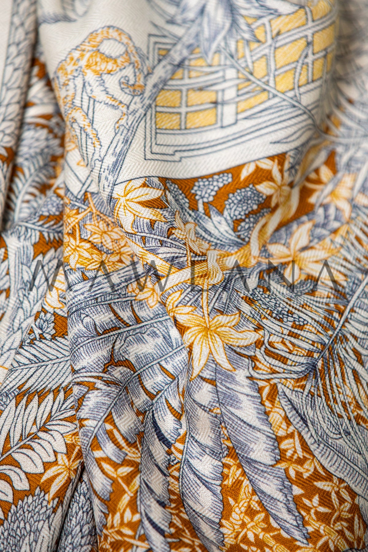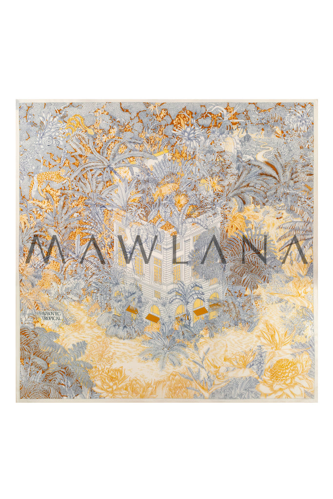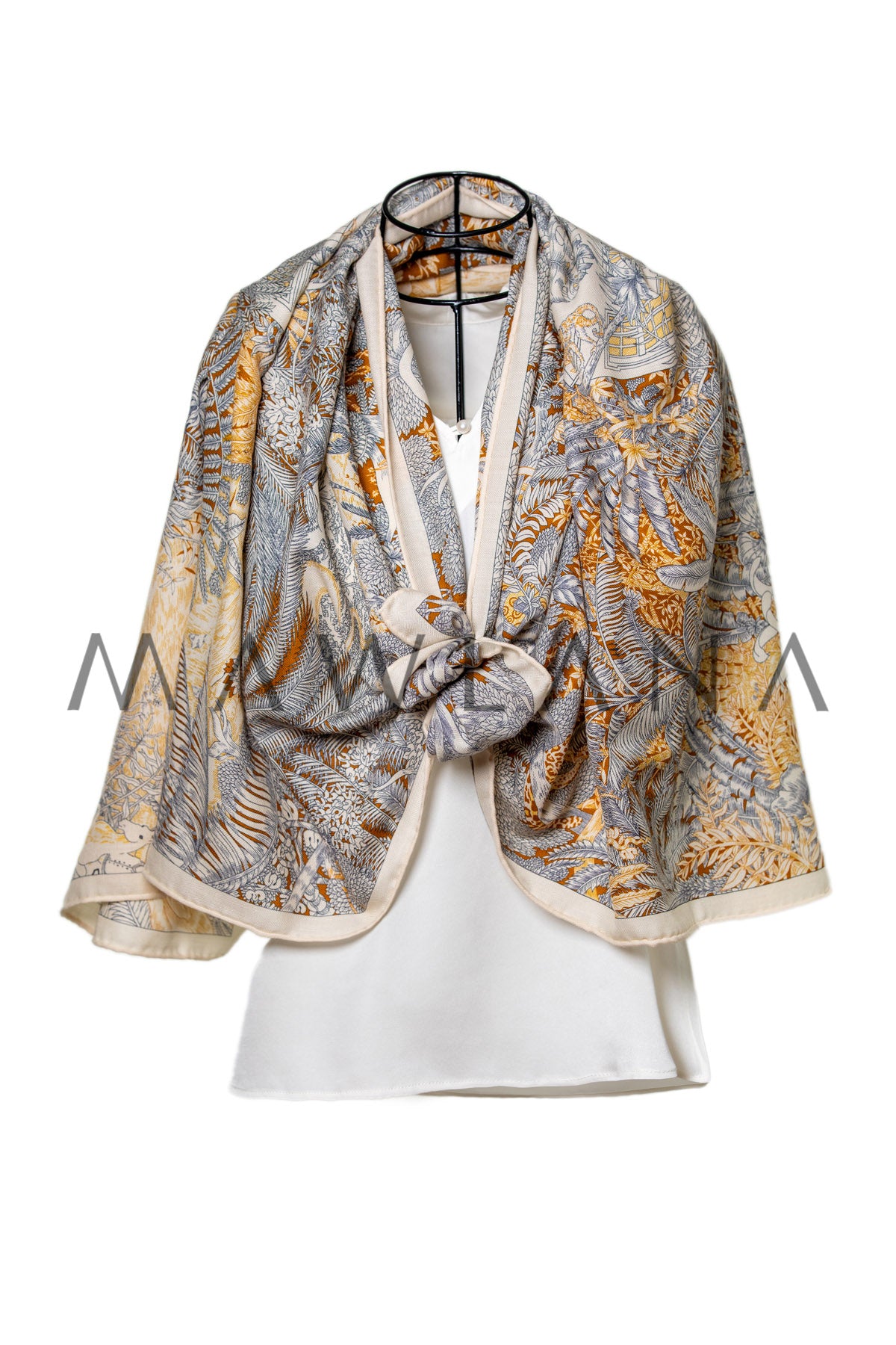 Hidden deep within a lush, golden jungle lies a secret villa—an oasis of elegance surrounded by wild beauty. This scarf transports you to that serene escape, where tigers wander among palm leaves and sunlight filters through silver and amber foliage.