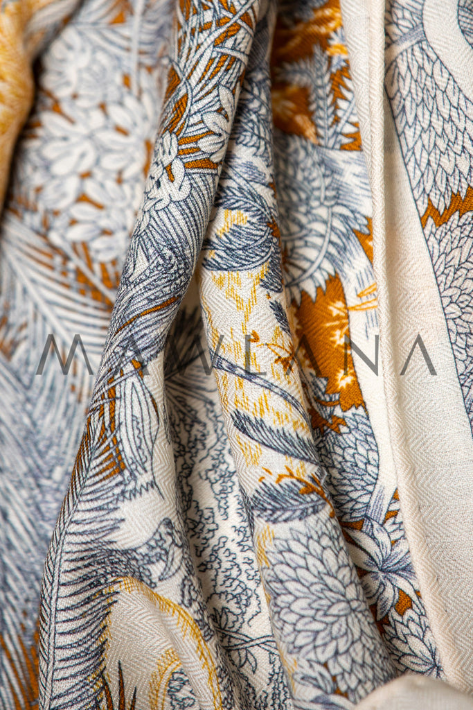 Intricately illustrated in warm gold and soft grey-blue tones, the design reveals more with each glance: tropical flowers blooming around arched windows, birds perched among oversized leaves, and the calm of a hidden paradise captured in fabric.