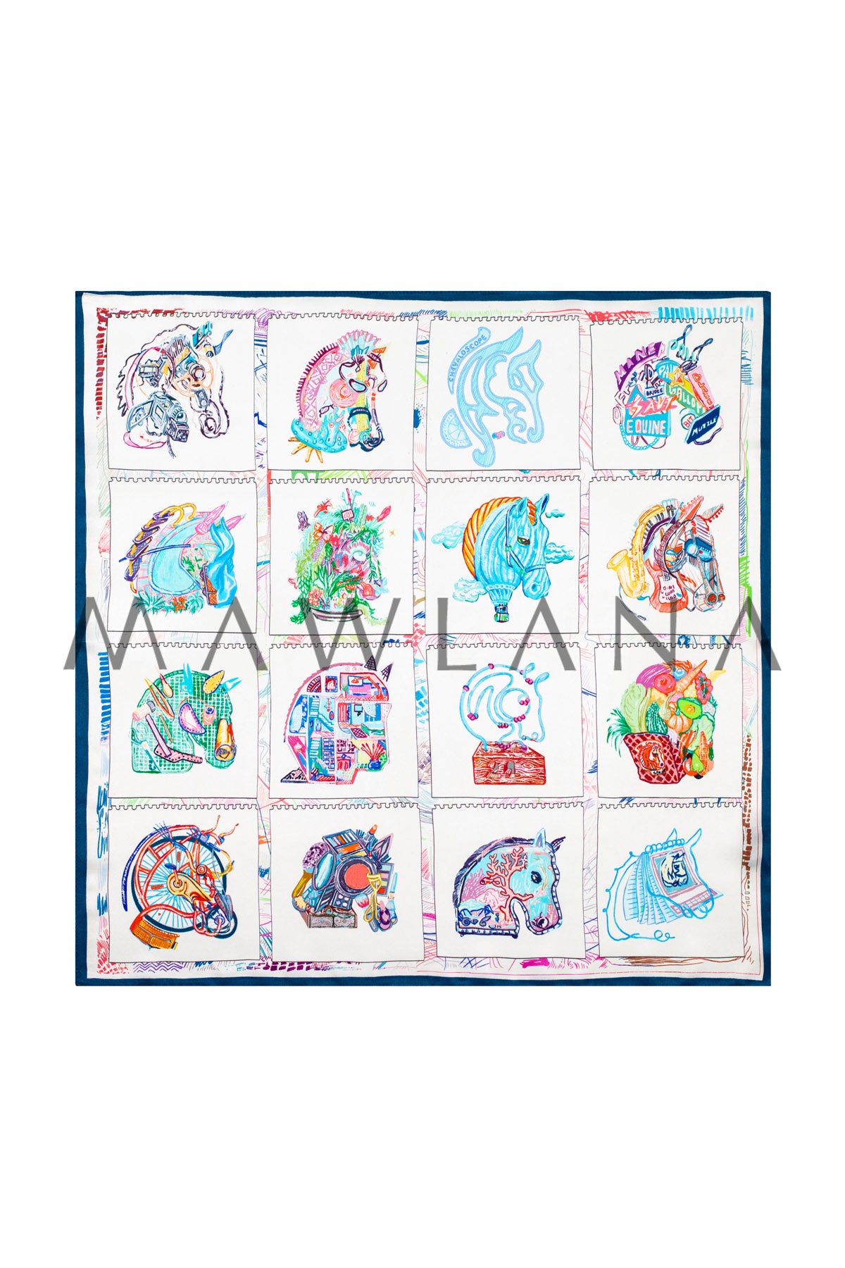 A celebration of imagination and individuality, this 100% natural silk scarf (50×50 cm) showcases a grid of twelve distinct horse head illustrations—each rendered in a unique artistic style. From pop art and surrealism to botanical, geometric, and abstract expressions, every square tells its own vibrant story.