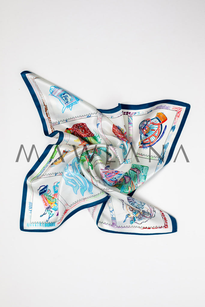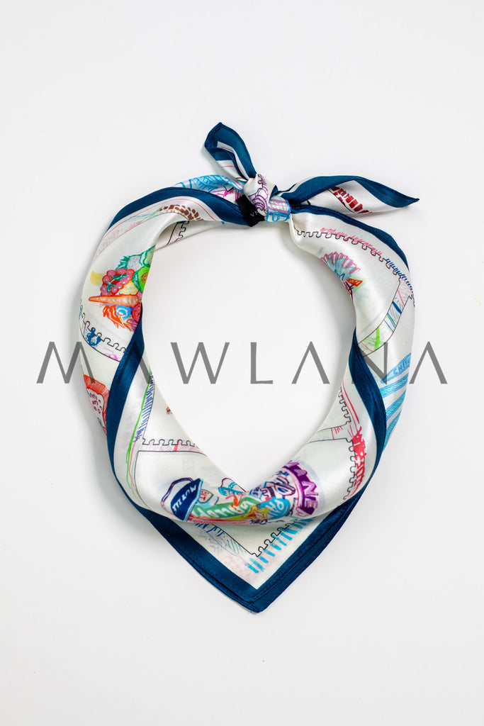The scarf's cream background is bordered in shades of blue, highlighting the playful and energetic use of colors like pink, turquoise, orange, and purple. It’s a bold and joyful accessory perfect for art lovers and creative spirits alike.