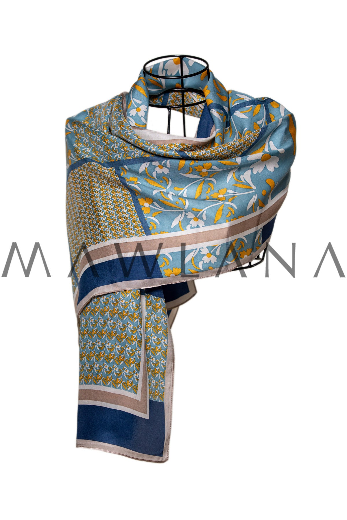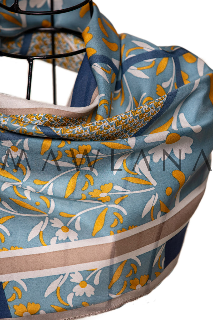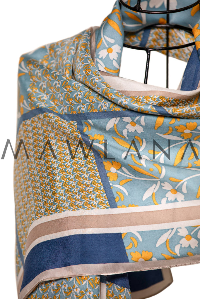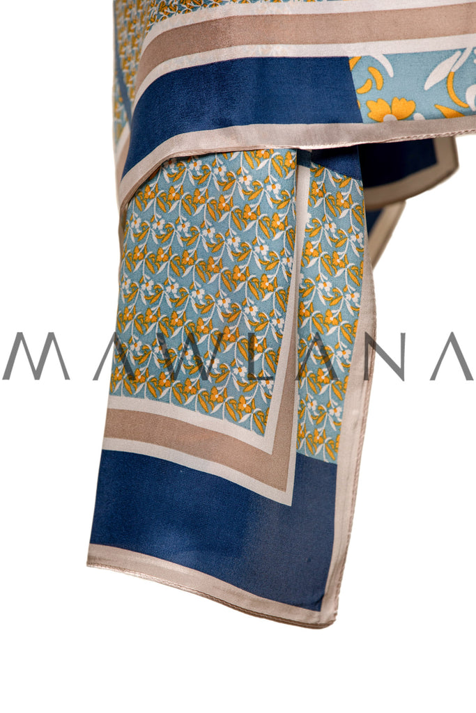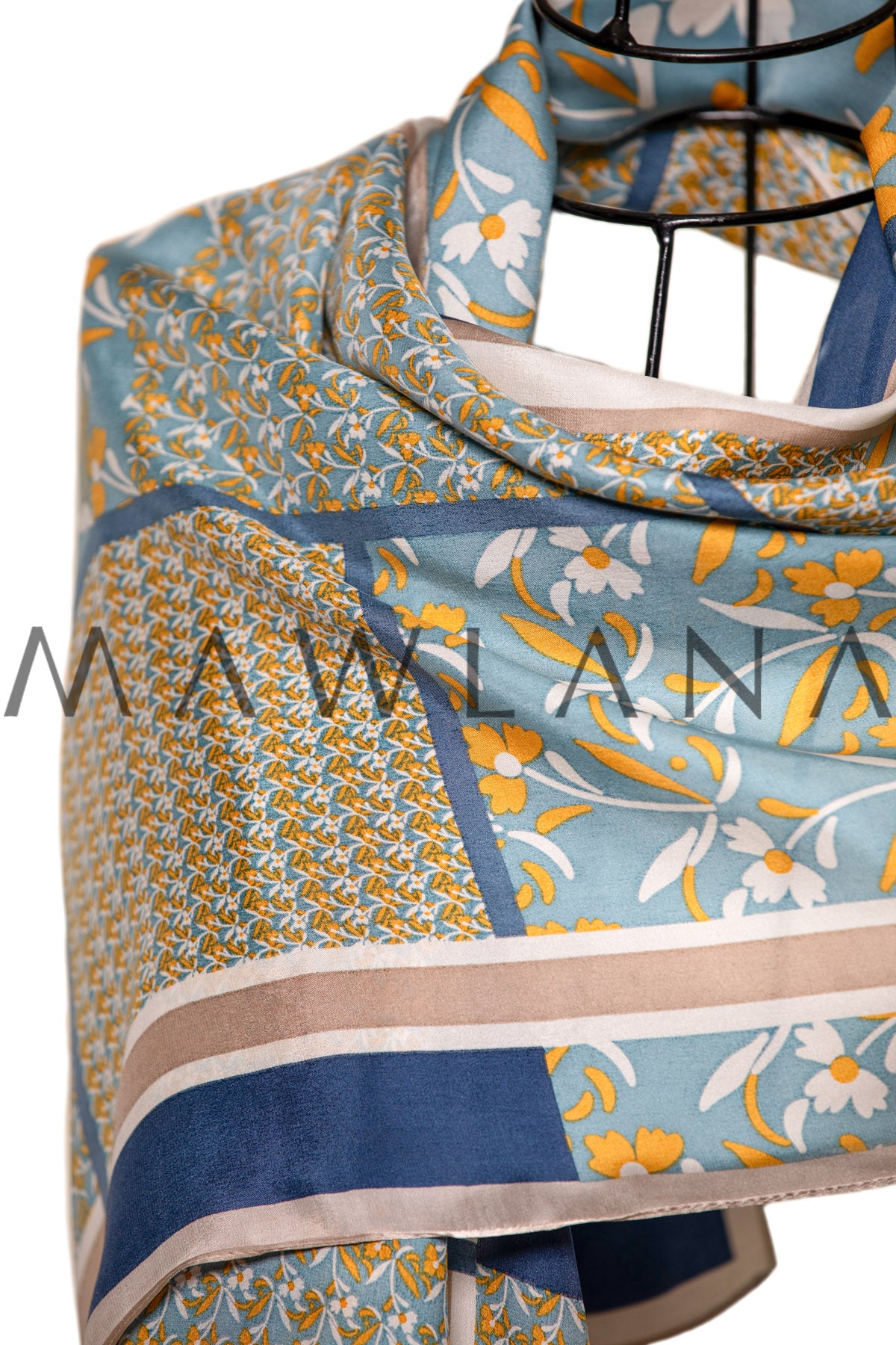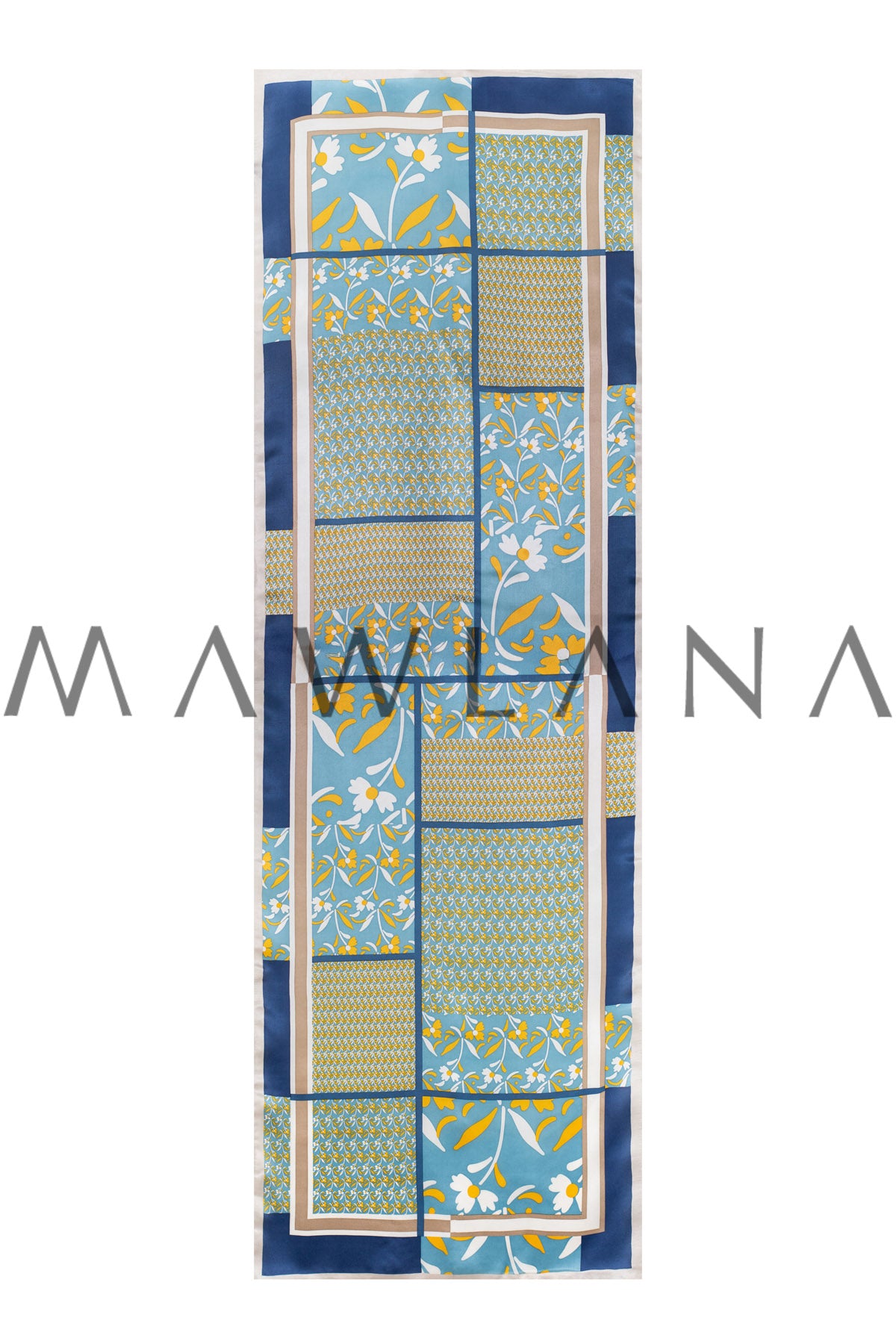 This scarf radiates joy and elegance through a refined mosaic-like design, featuring delicate white flowers and yellow leaves over sky blue and navy blue panels. The geometric repetition of floral elements creates a harmonious rhythm that adds a contemporary yet warm aesthetic.