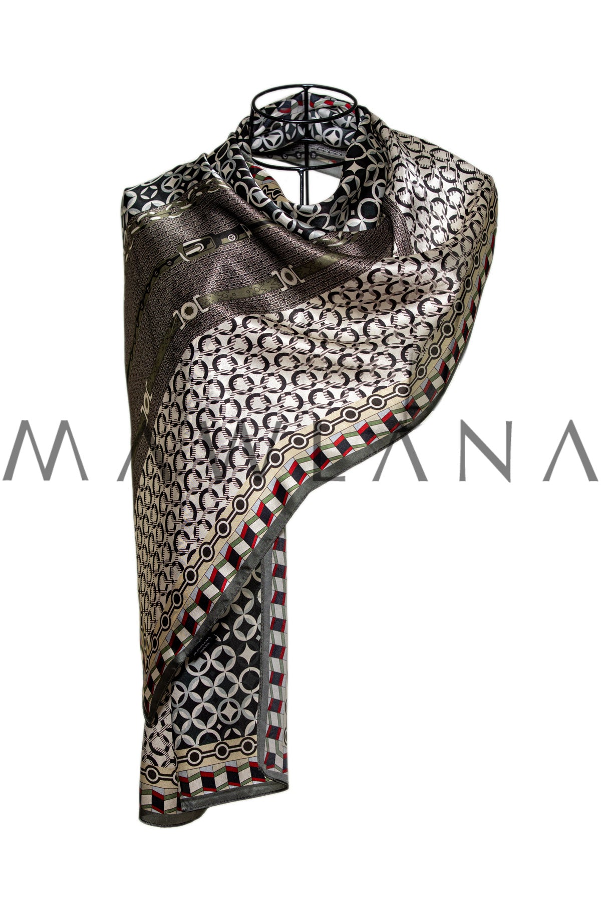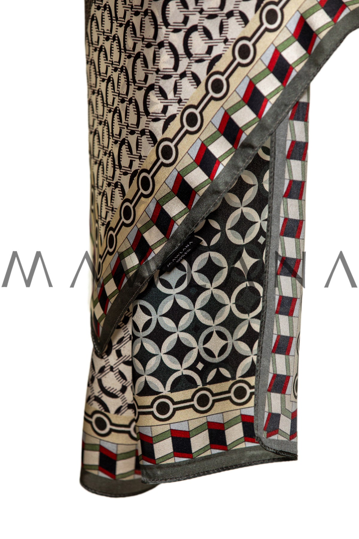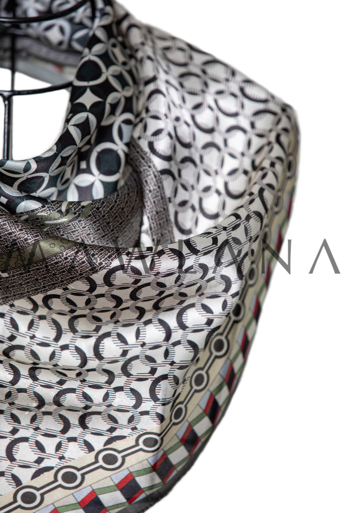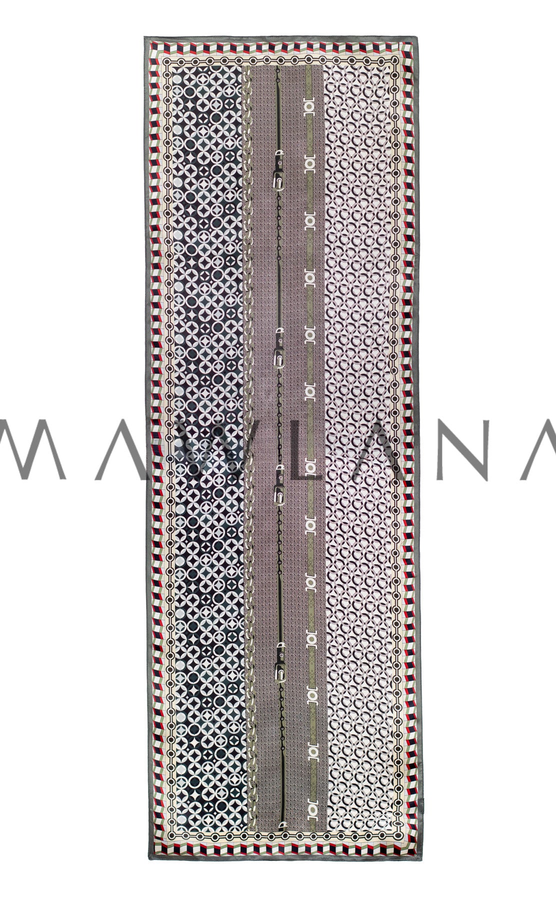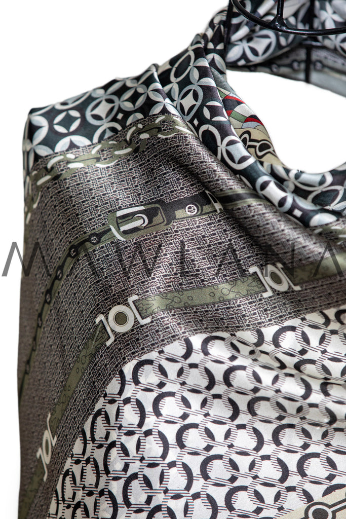 This scarf beautifully blends geometric minimalism with a touch of classic elegance, featuring a harmonious mix of repeating patterns in black, white, and olive gray. Framed by a vivid 3D-like border in red, green, and gray tones, it’s further enriched by equestrian chain details that evoke a sense of strength and sophistication.