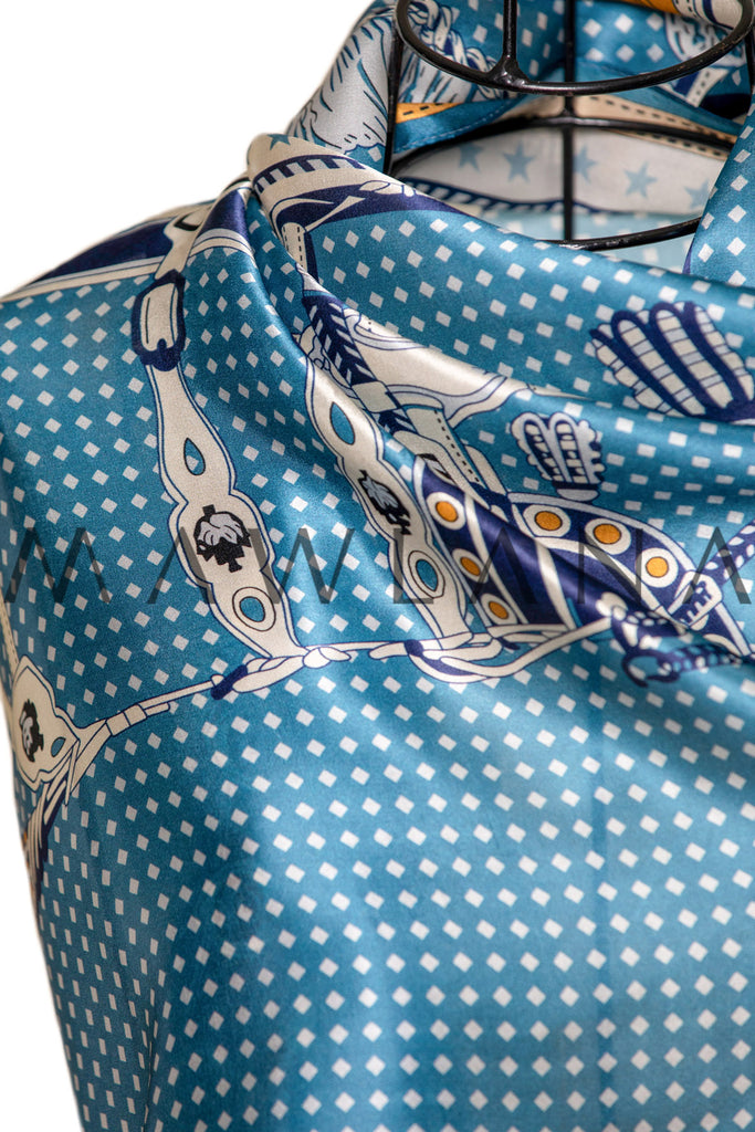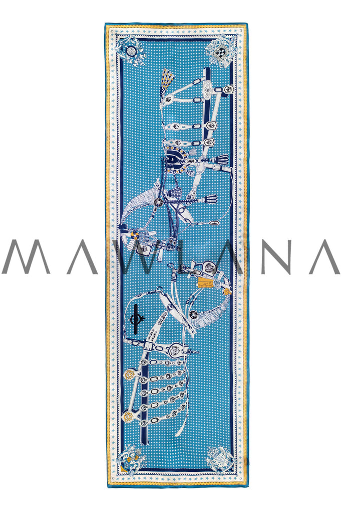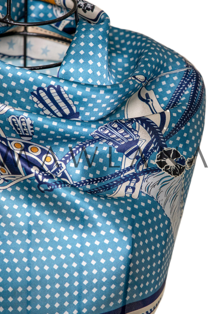 This unique scarf design is inspired by the world of equestrian elegance. Bridles, buckles, and metallic elements intertwine across a dotted blue background, creating a perfect harmony between classic charm and modern flair. The decorative border in shades of blue and gold gives the scarf a regal, luxurious touch.