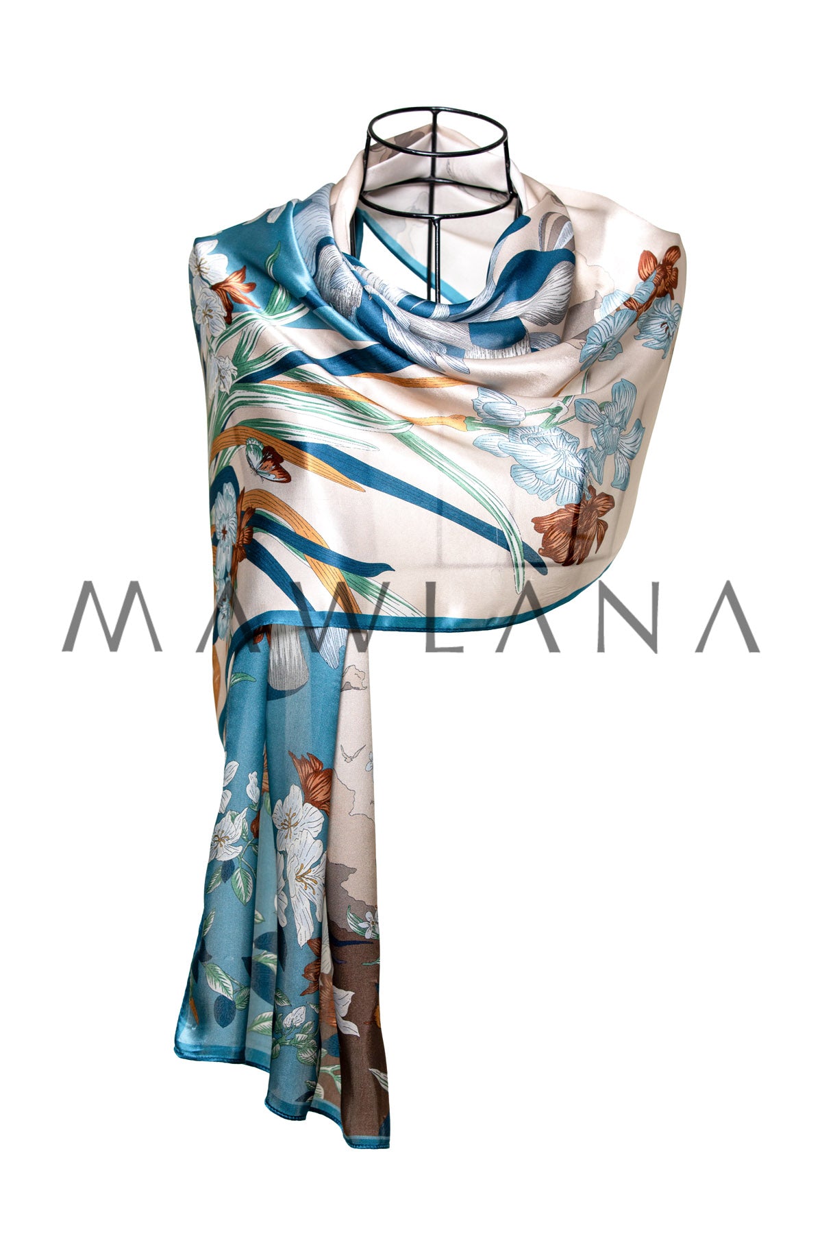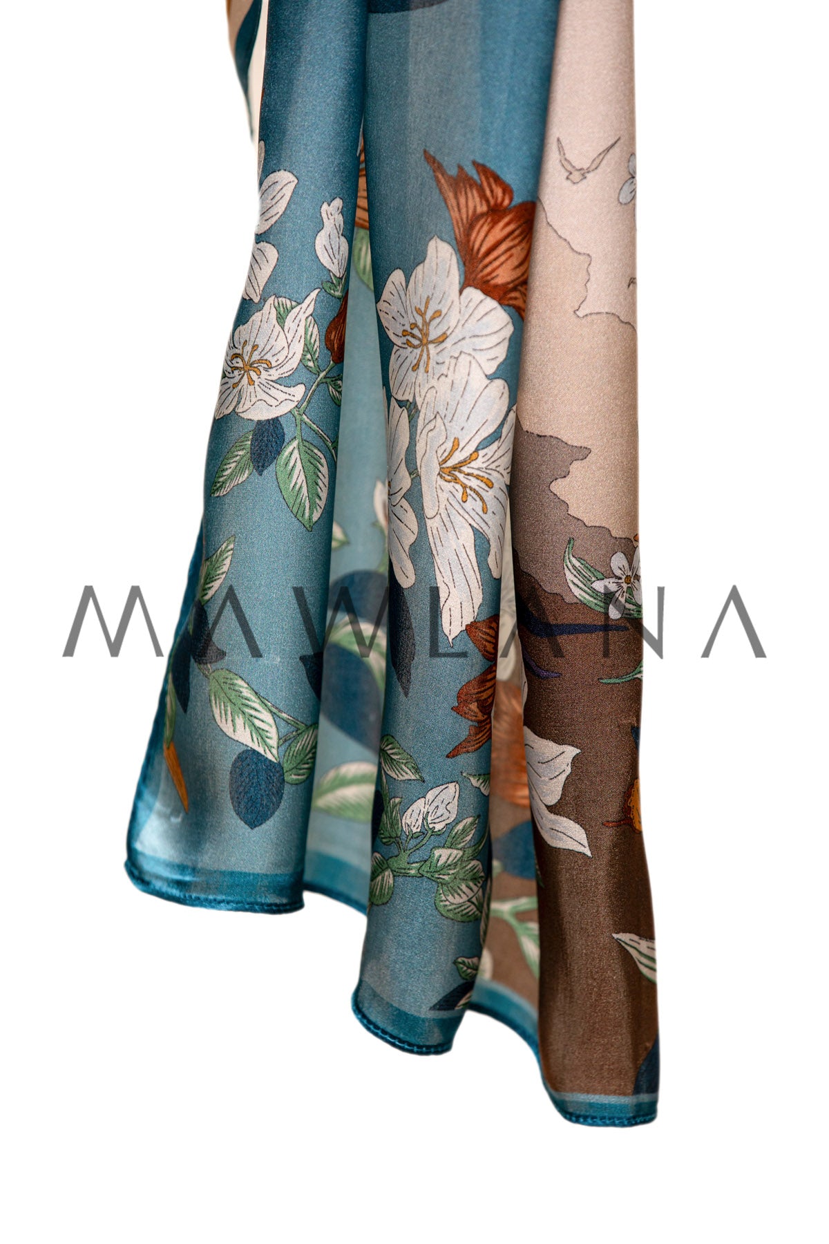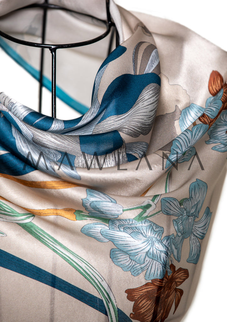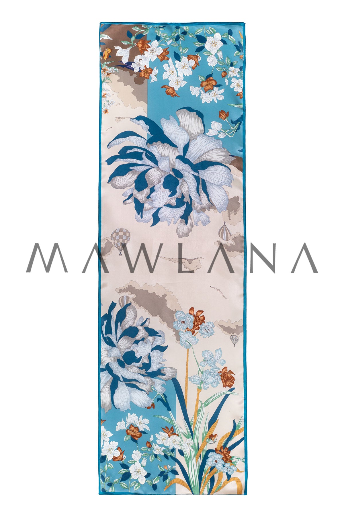 A vivid artwork in silk, this scarf brings together oversized blooming flowers against a dreamy sky of beige and turquoise. White, blue, and amber blossoms sway in poetic harmony, while distant hot air balloons add a whimsical touch of wonder and travel.
