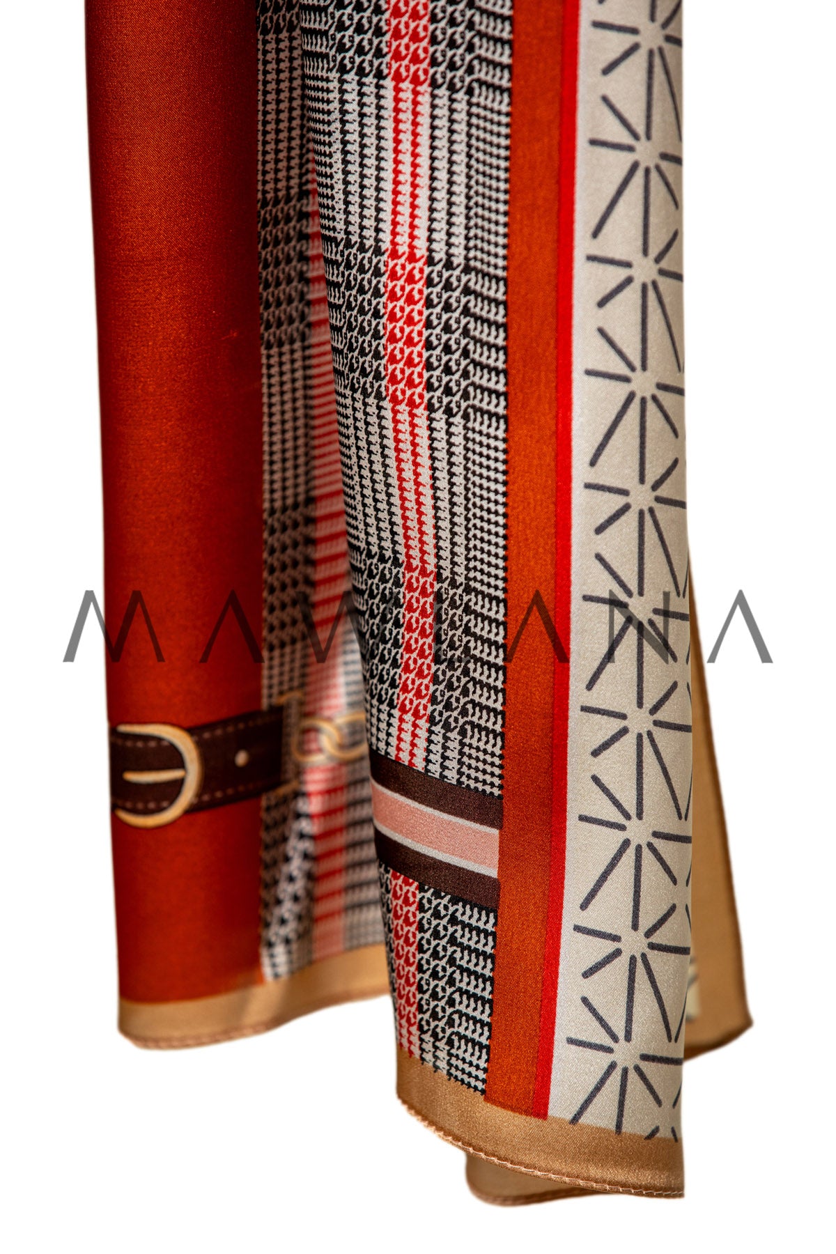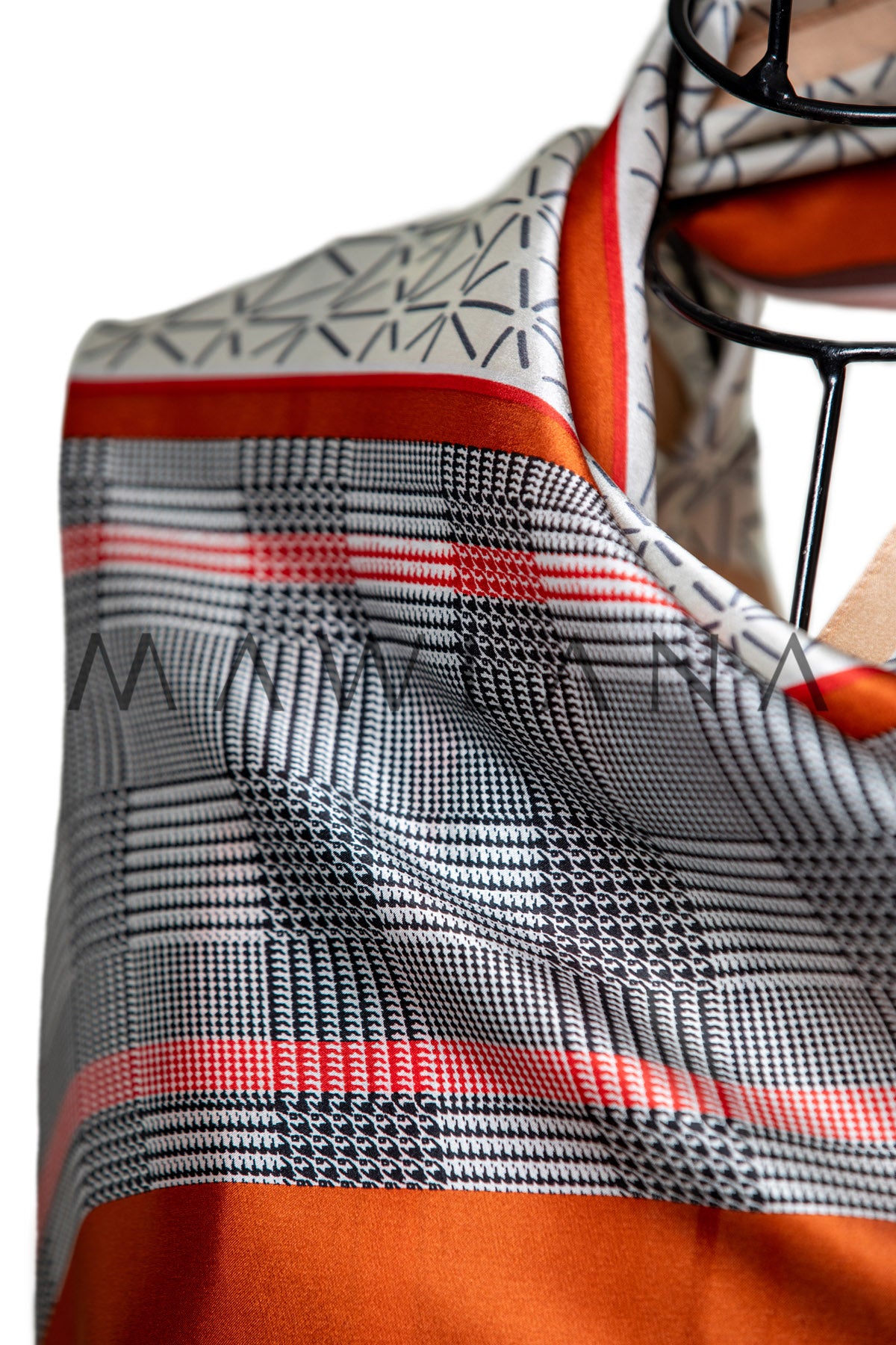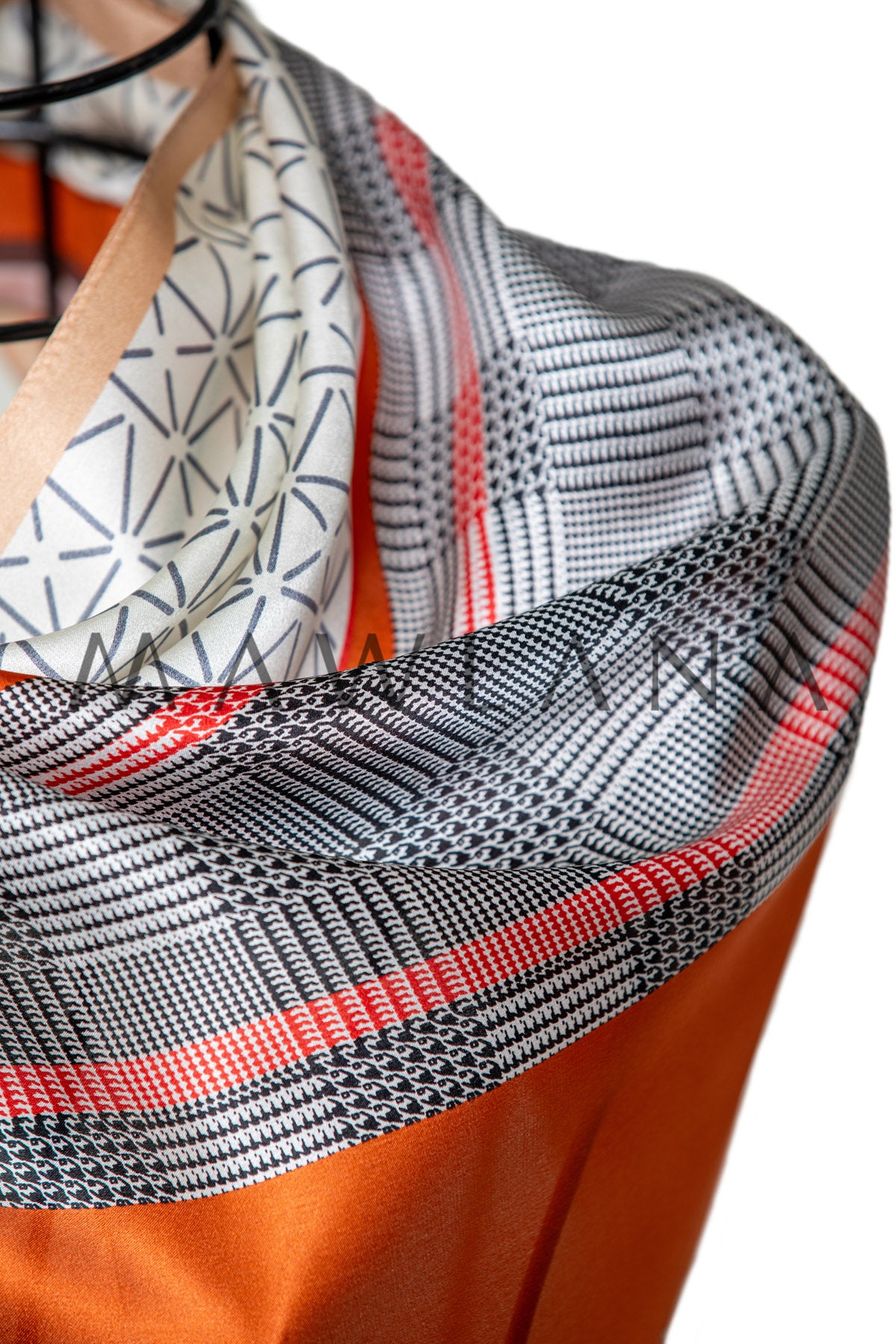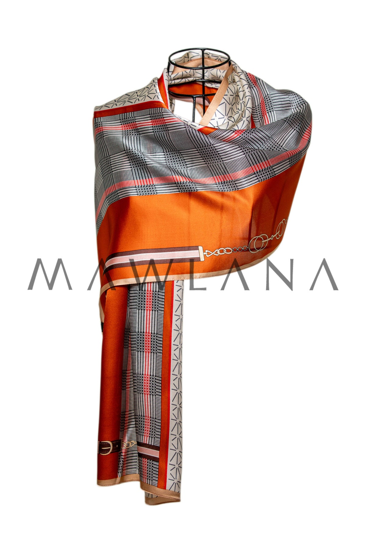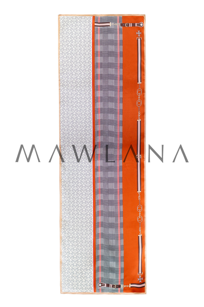 This scarf showcases a bold, contemporary design that blends fine geometric patterns with classic tartan stripes, accented by a warm orange panel adorned with belt- and chain-inspired motifs. The harmony between structure and color gives this piece a unique character that bridges modern flair and timeless elegance.