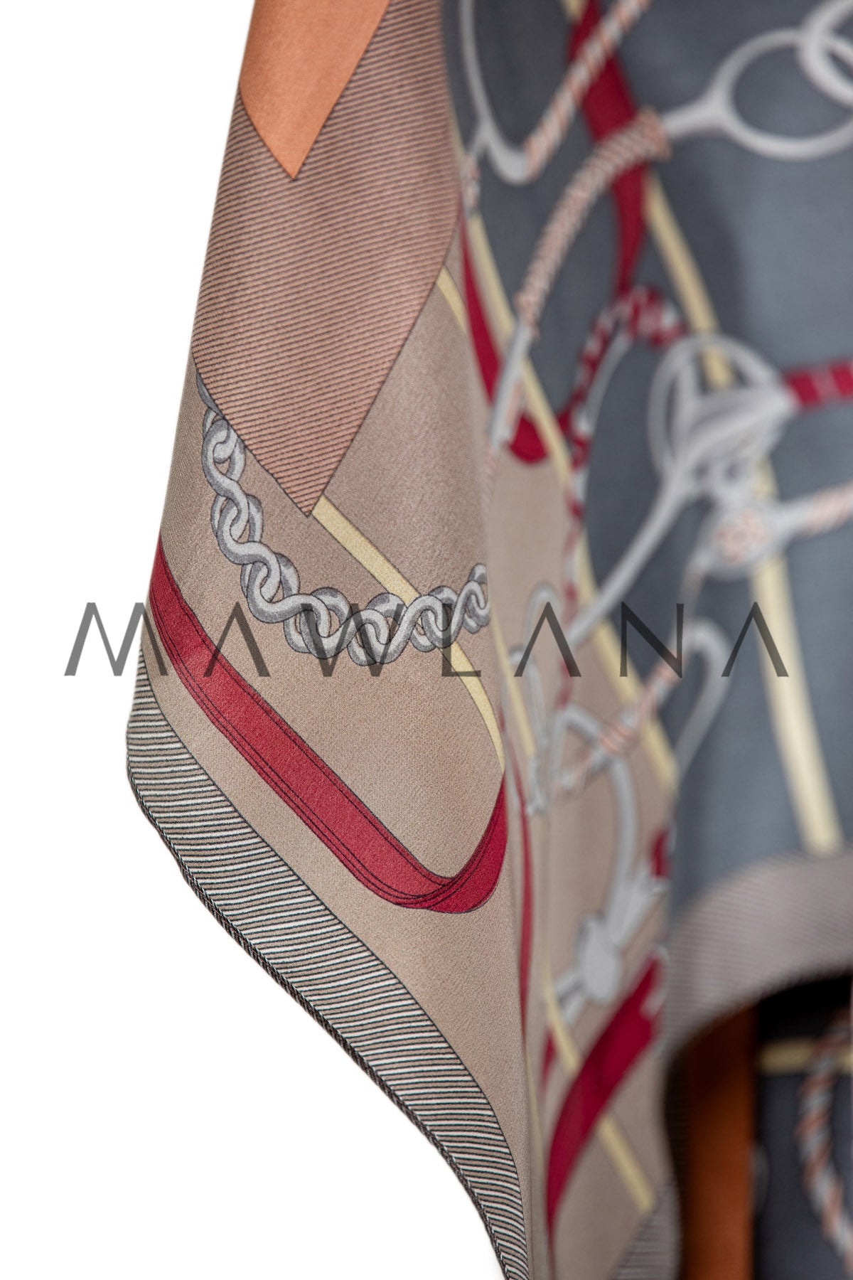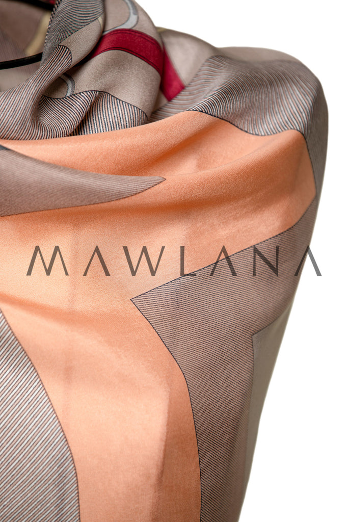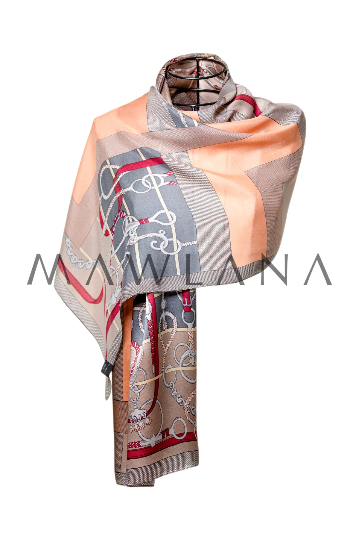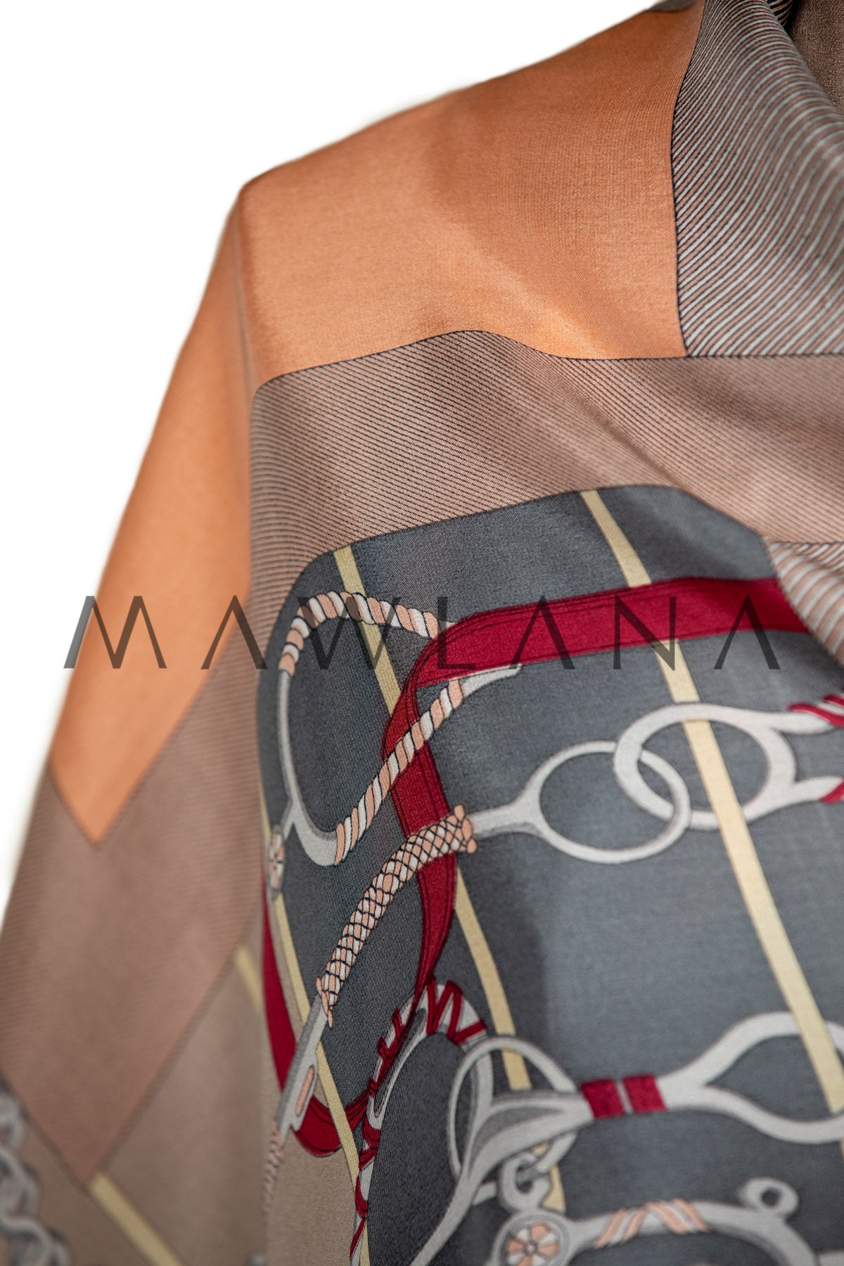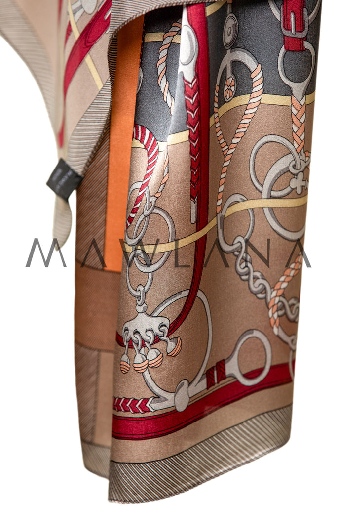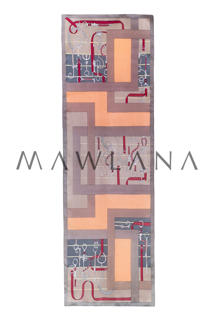 This scarf is a dynamic composition of structured geometry and classic equestrian elegance. Intertwining soft beige and light orange tones with detailed illustrations of bridles and bits, it achieves a modern yet grounded aesthetic.