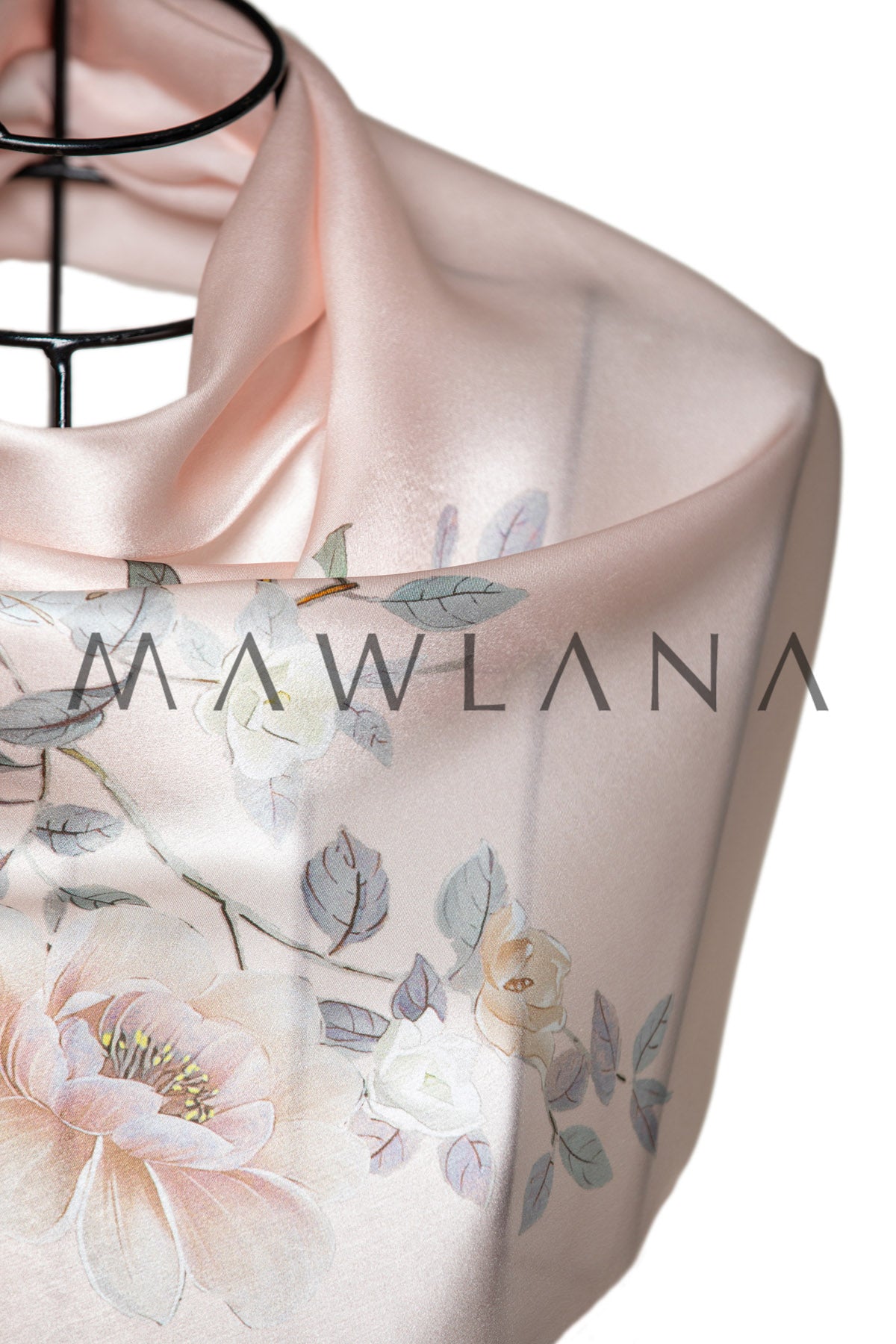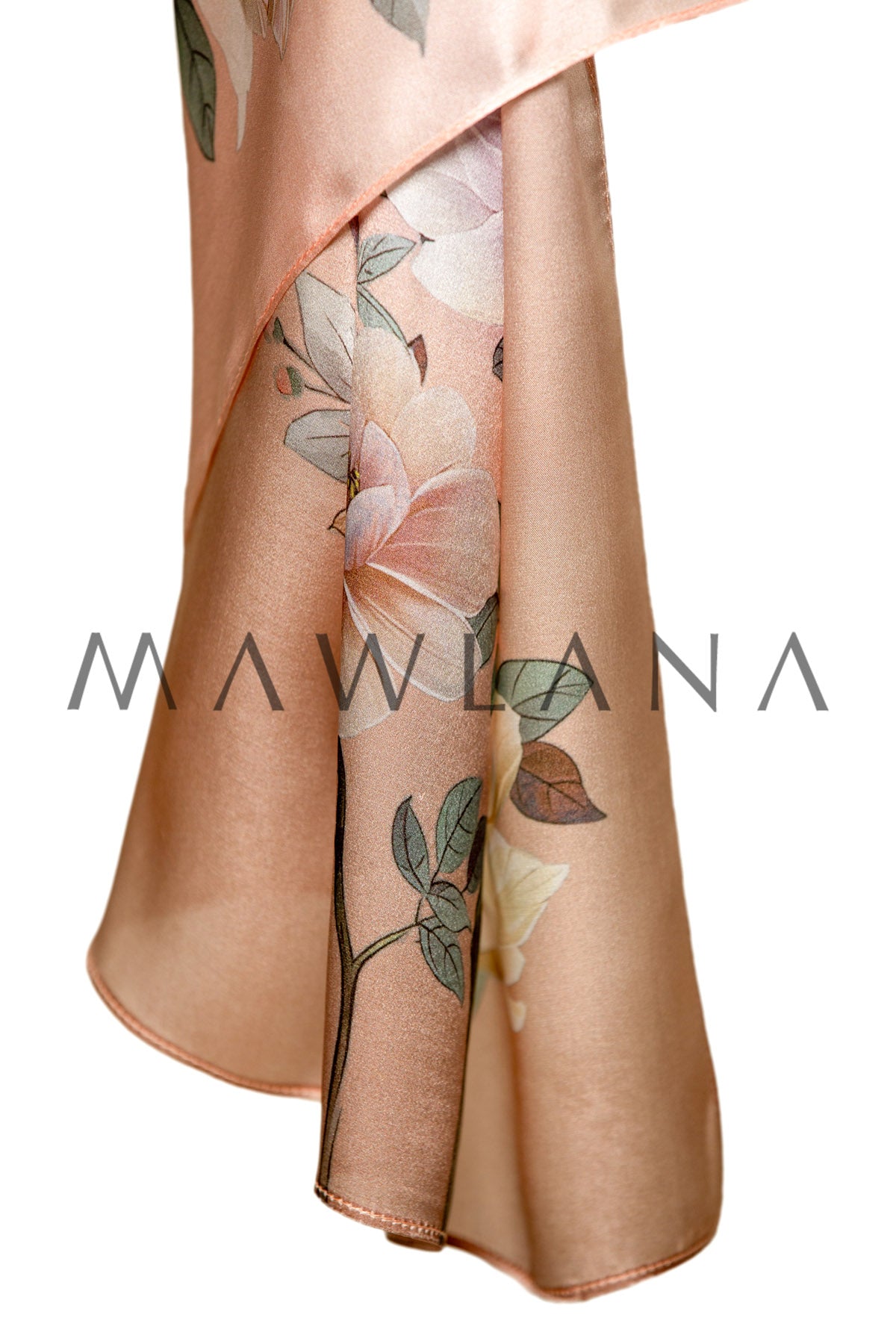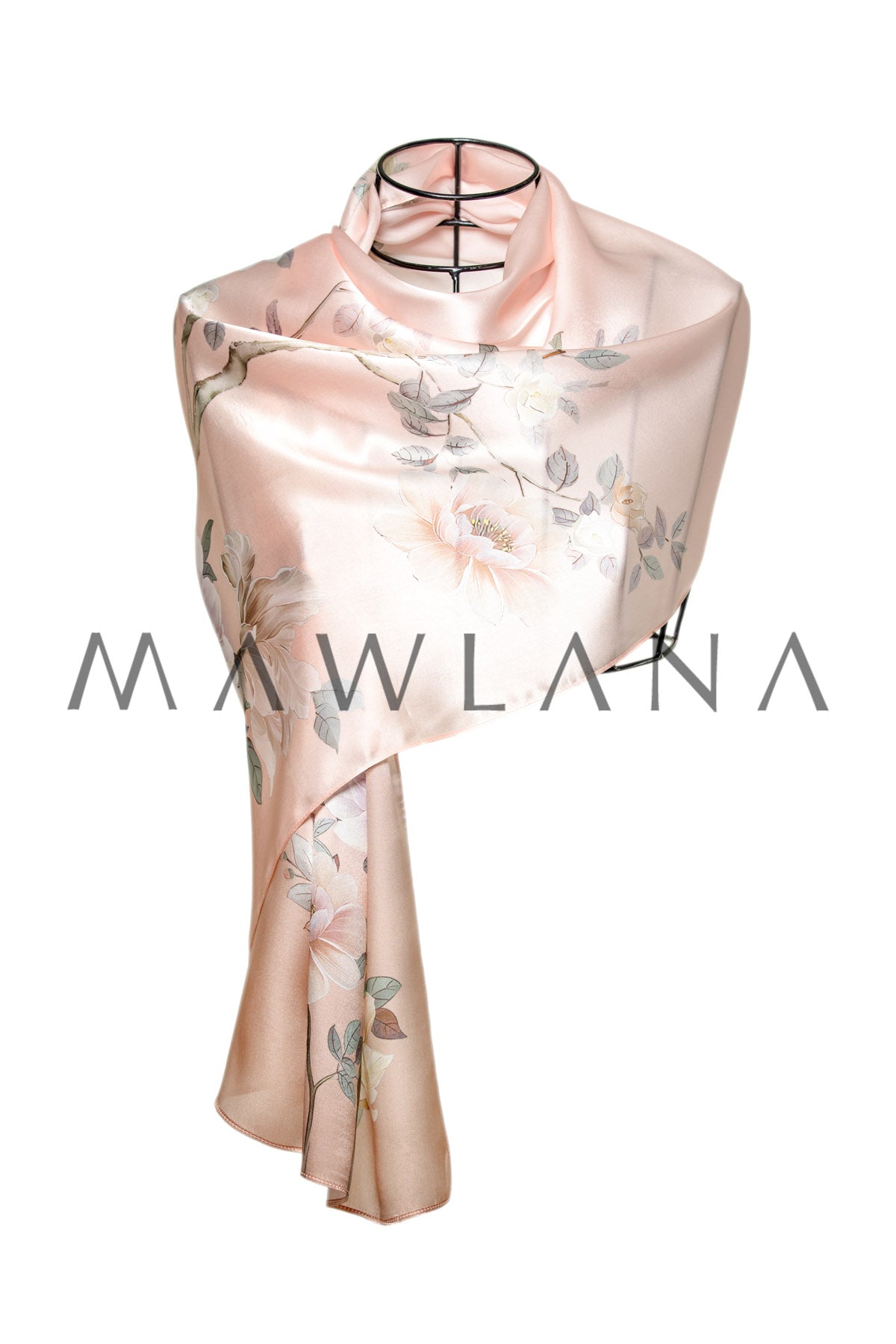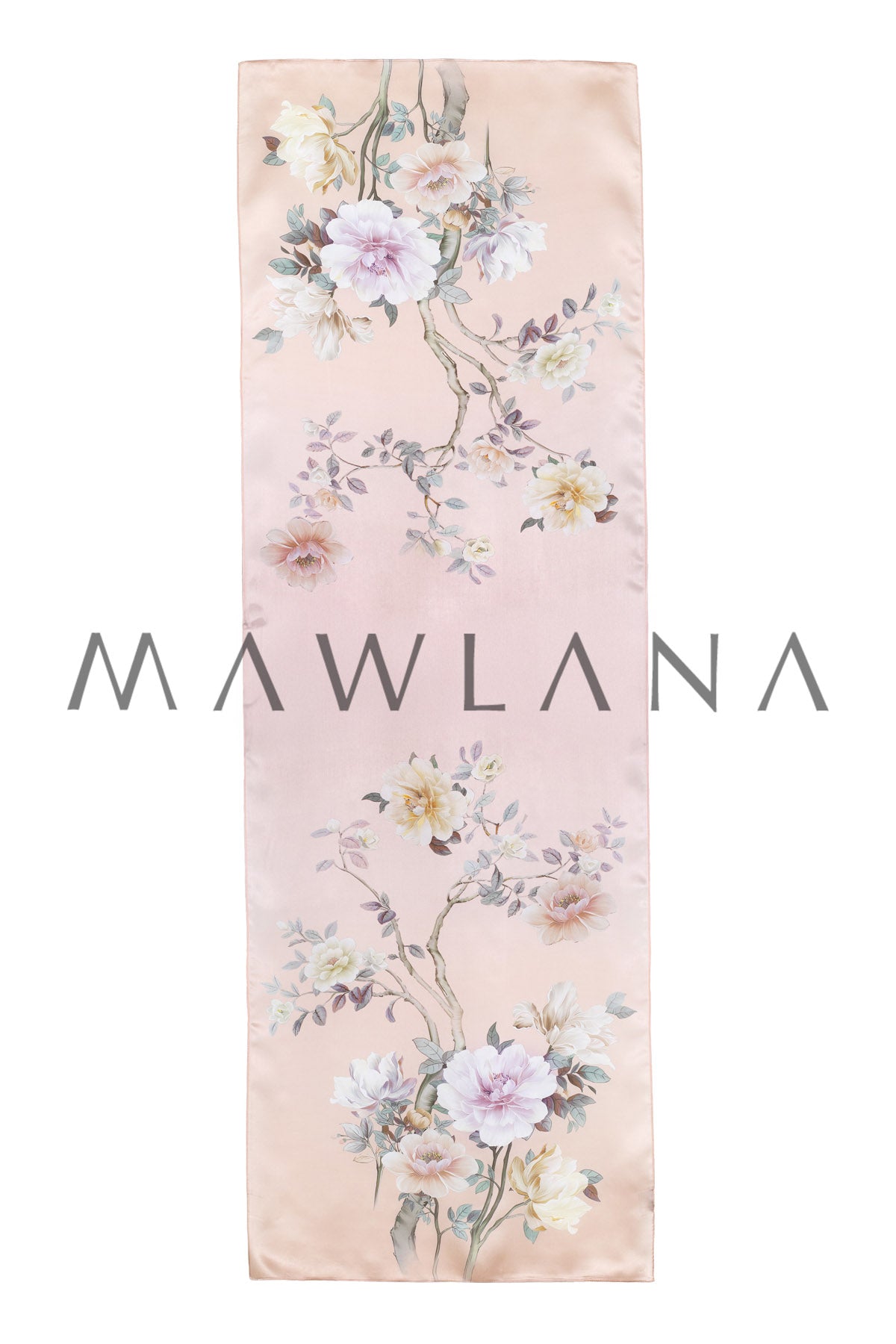 This silk scarf radiates softness and femininity, featuring a light blush pink background adorned with pastel-hued blooming branches. The floral design evokes a sense of timeless elegance and renewal, like a classical painting brought to life on luxurious fabric.