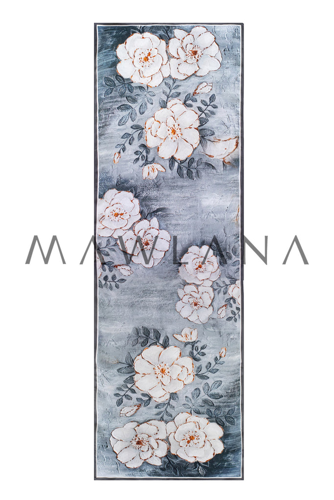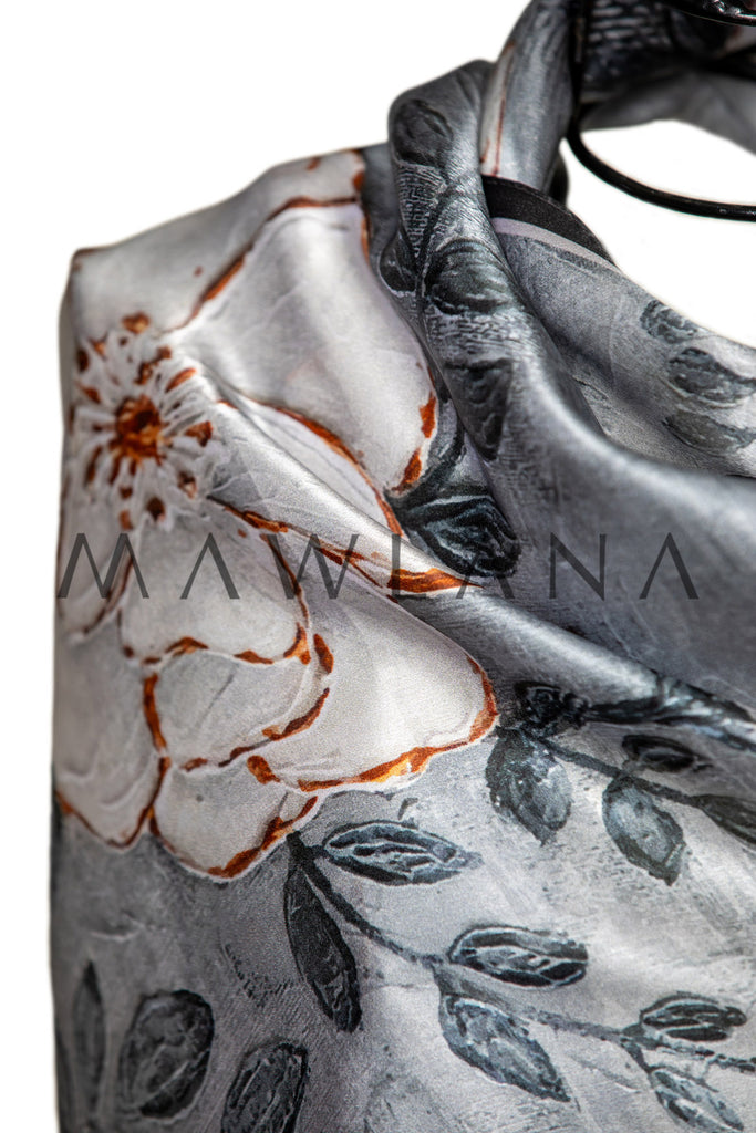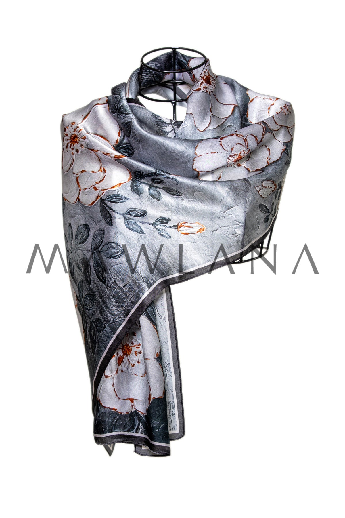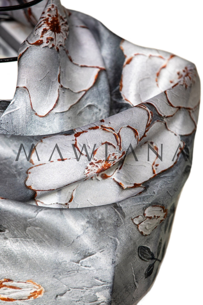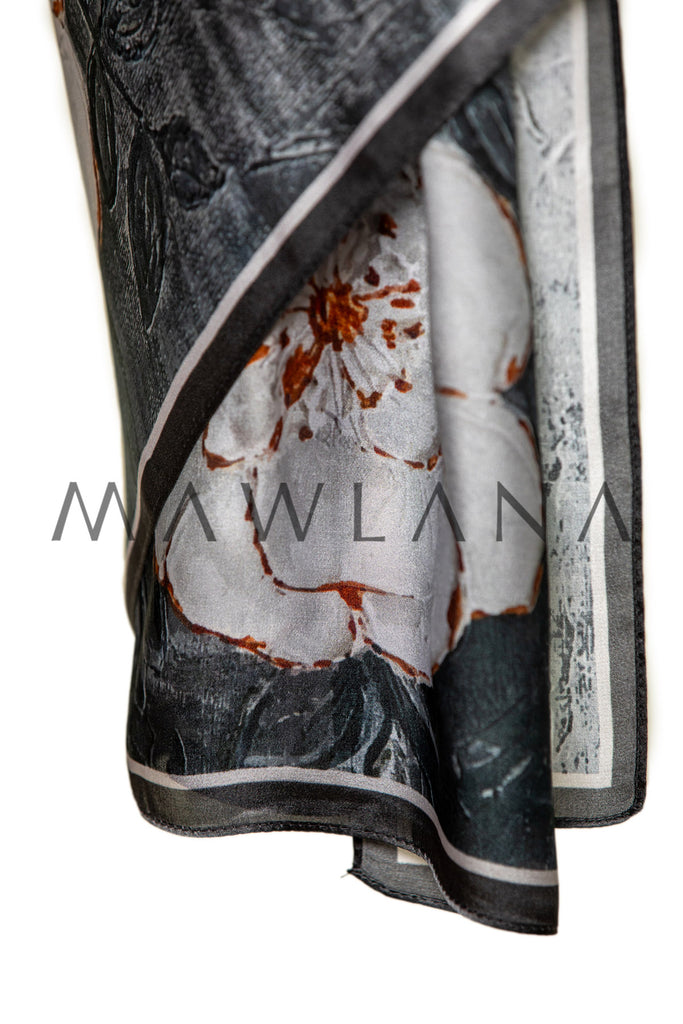 This scarf blends the strength of grey gradients with the softness of delicate white blossoms, resembling a hand-painted artwork on pure silk. The flowers bloom in fine detail over a moody, cloud-like background, creating an elegant balance between mystery and beauty. A refined artistic touch to elevate any outfit.