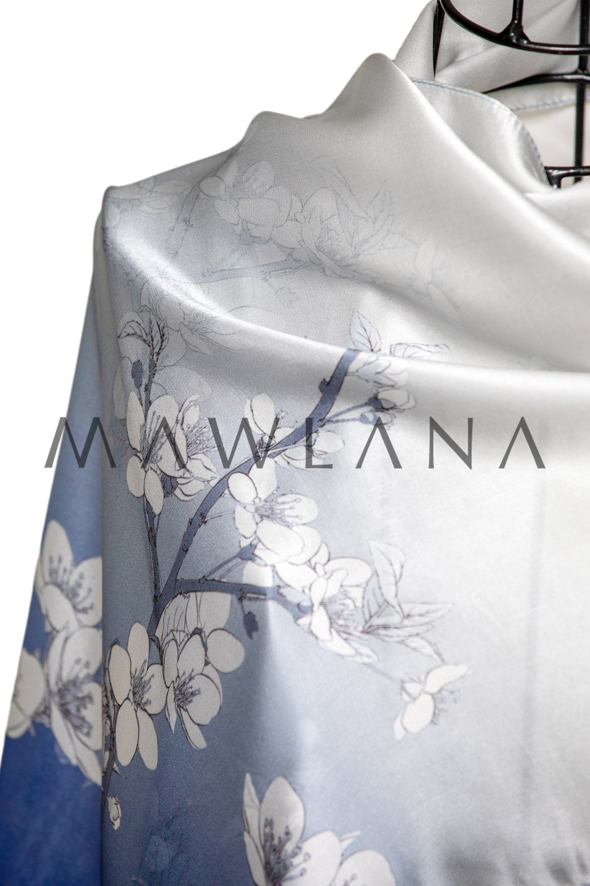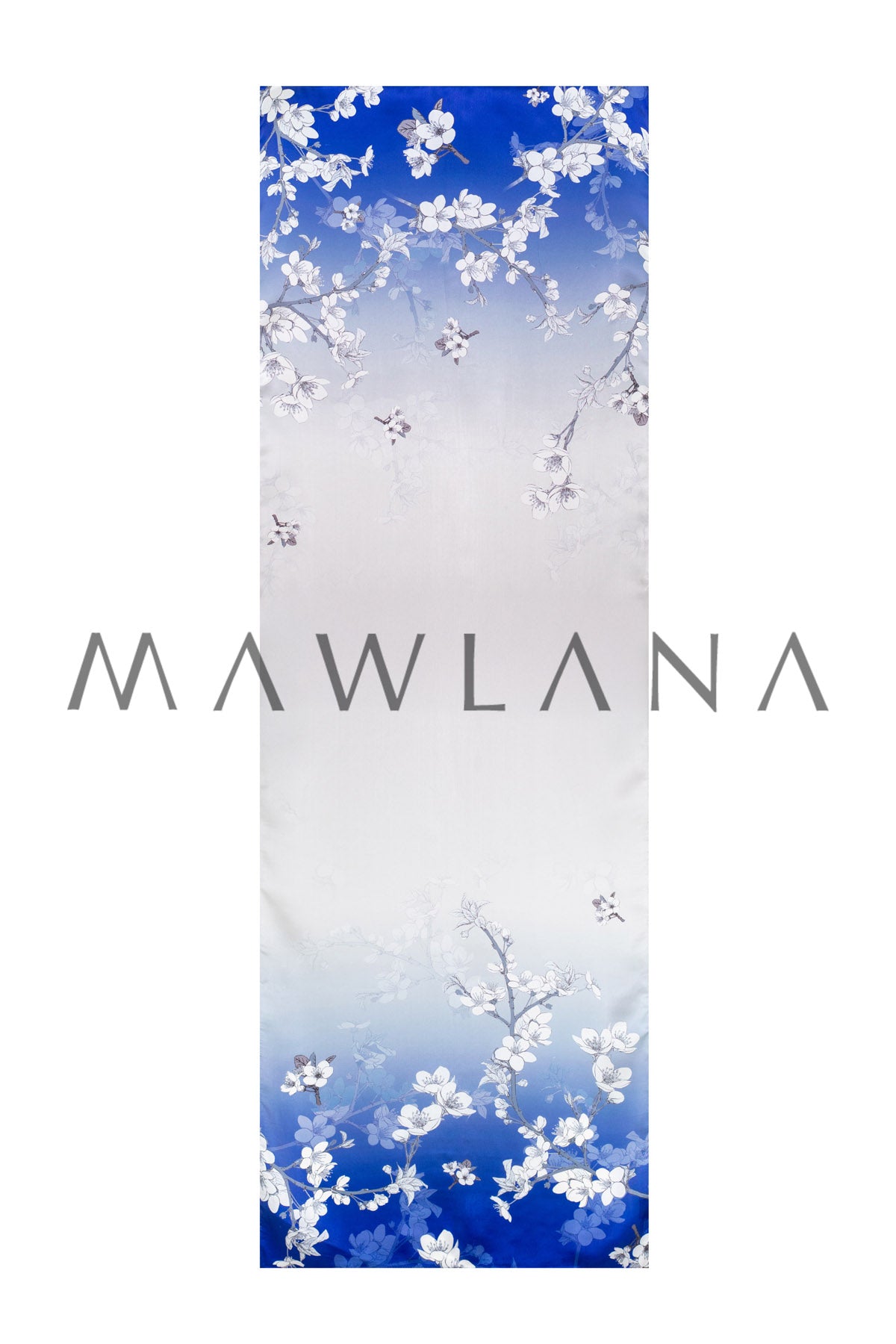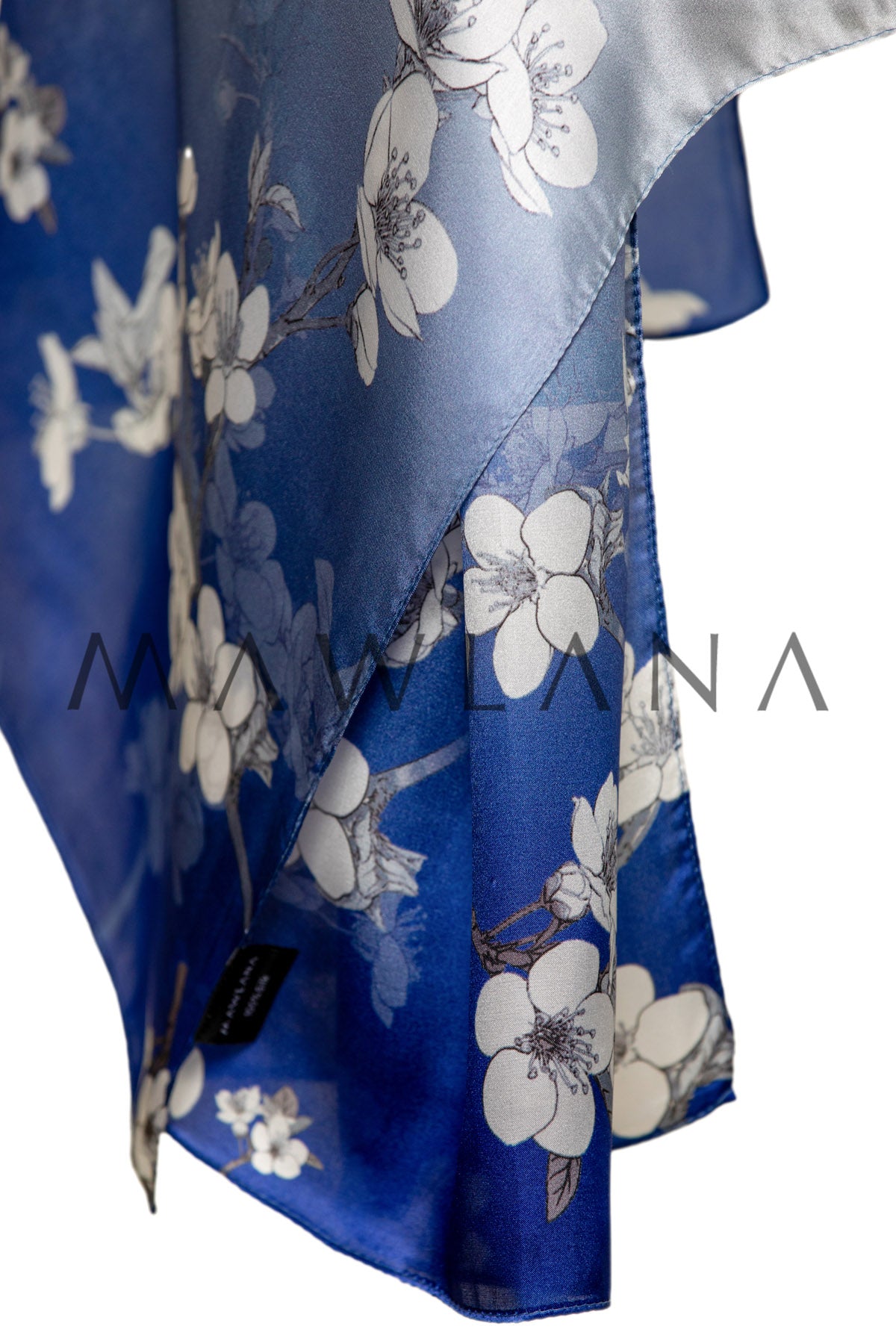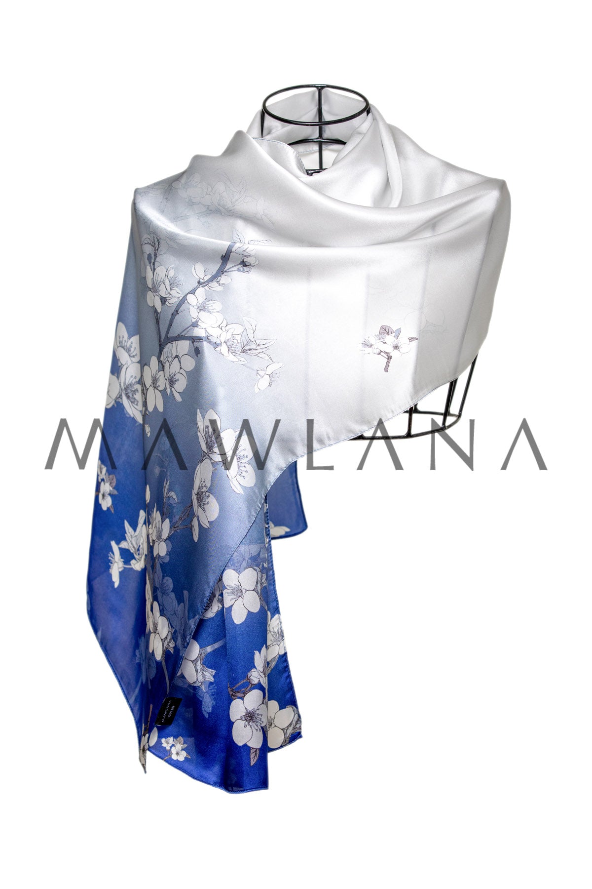 The scarf is adorned with an artistic motif of blooming white camellia flowers, brought to life with rich green leaves and delicate detailing. Set against a background of deep blue and antique gold hues, the design resembles a painted masterpiece—radiating grace, femininity, and refinement. This silk scarf is more than an accessory; it’s a story of spring blossoms captured in their most graceful moment.