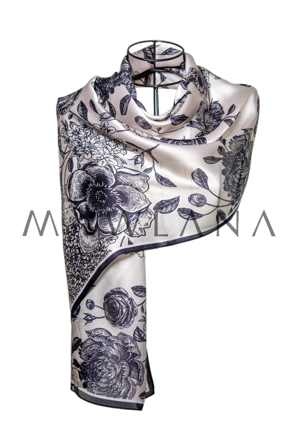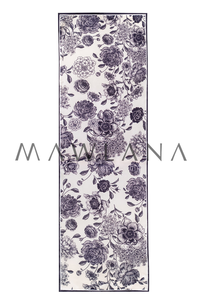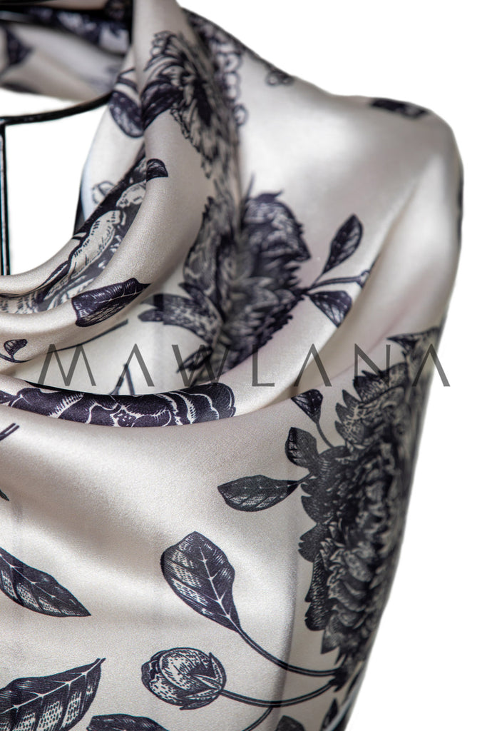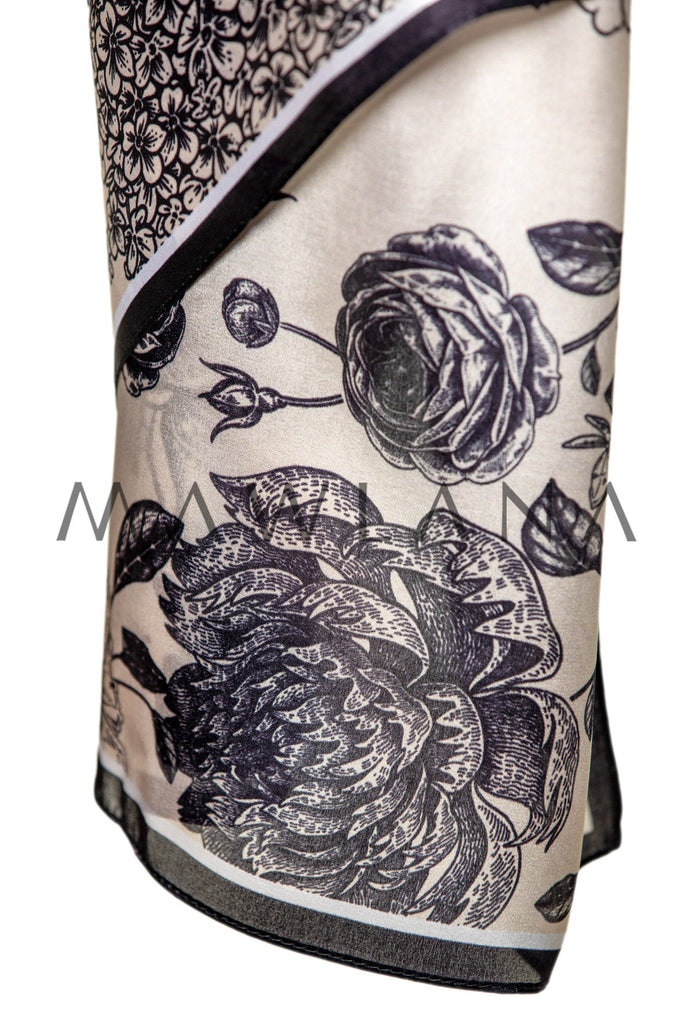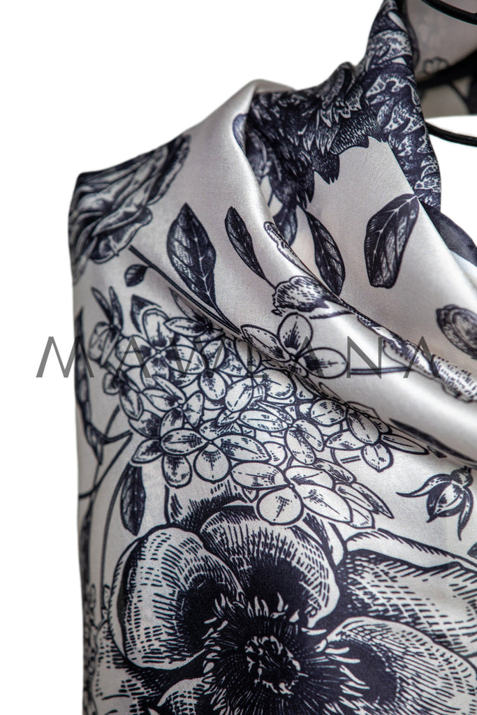 Step into timeless elegance with this captivating scarf, crafted from 100% pure silk and measuring 53 × 173 cm. The classic ivory background is adorned with intricate black floral illustrations that resemble fine ink sketches, offering a beautiful blend of refinement and artistry.