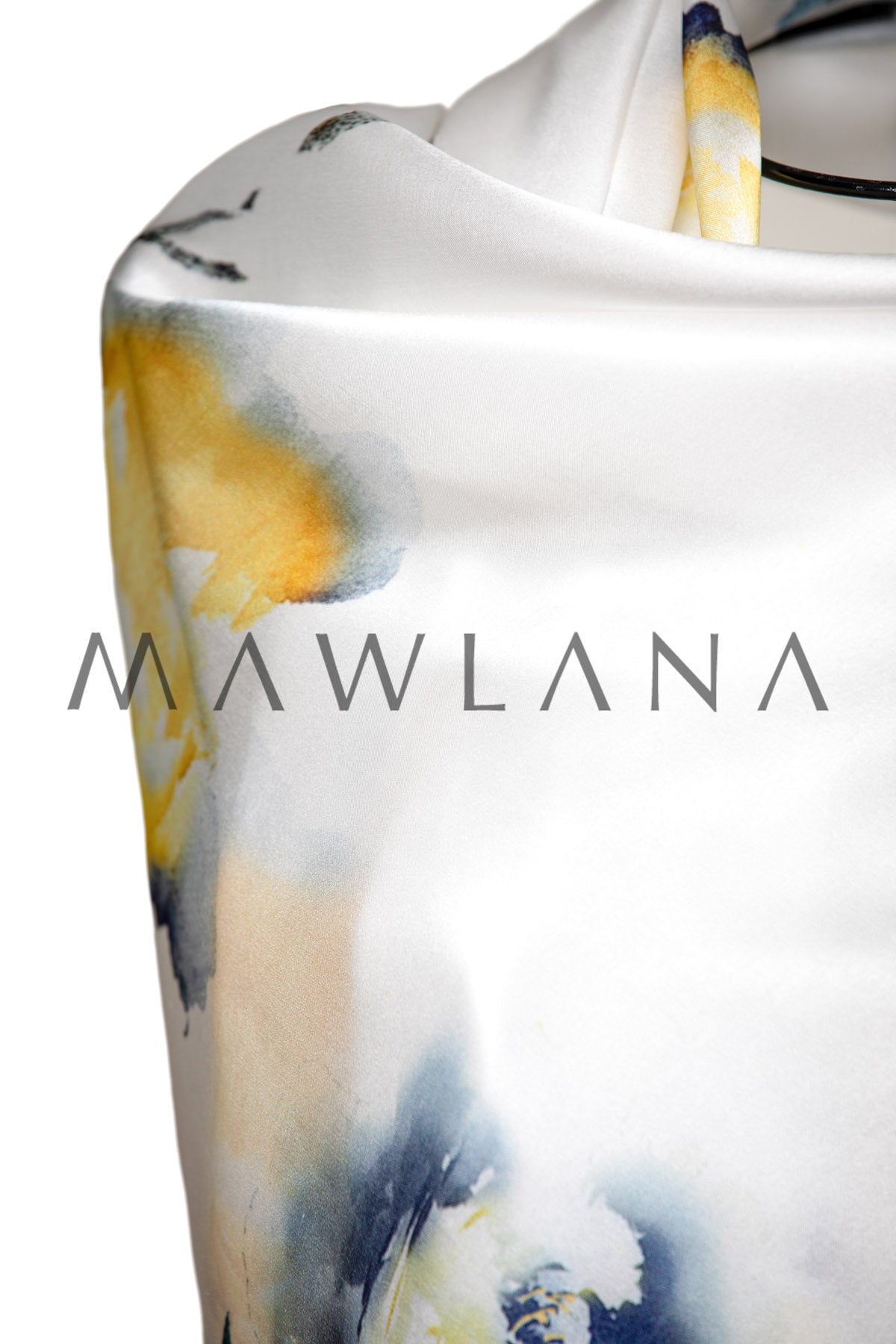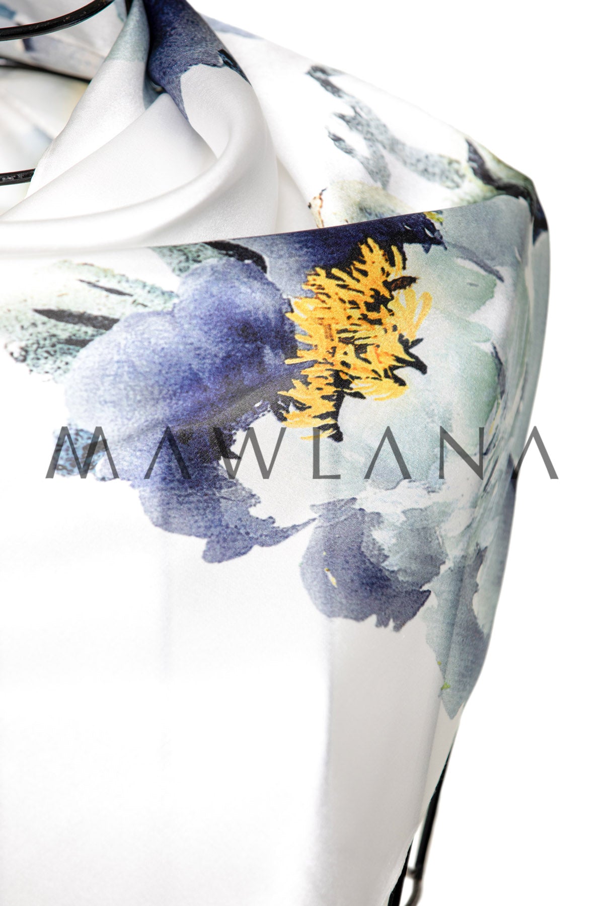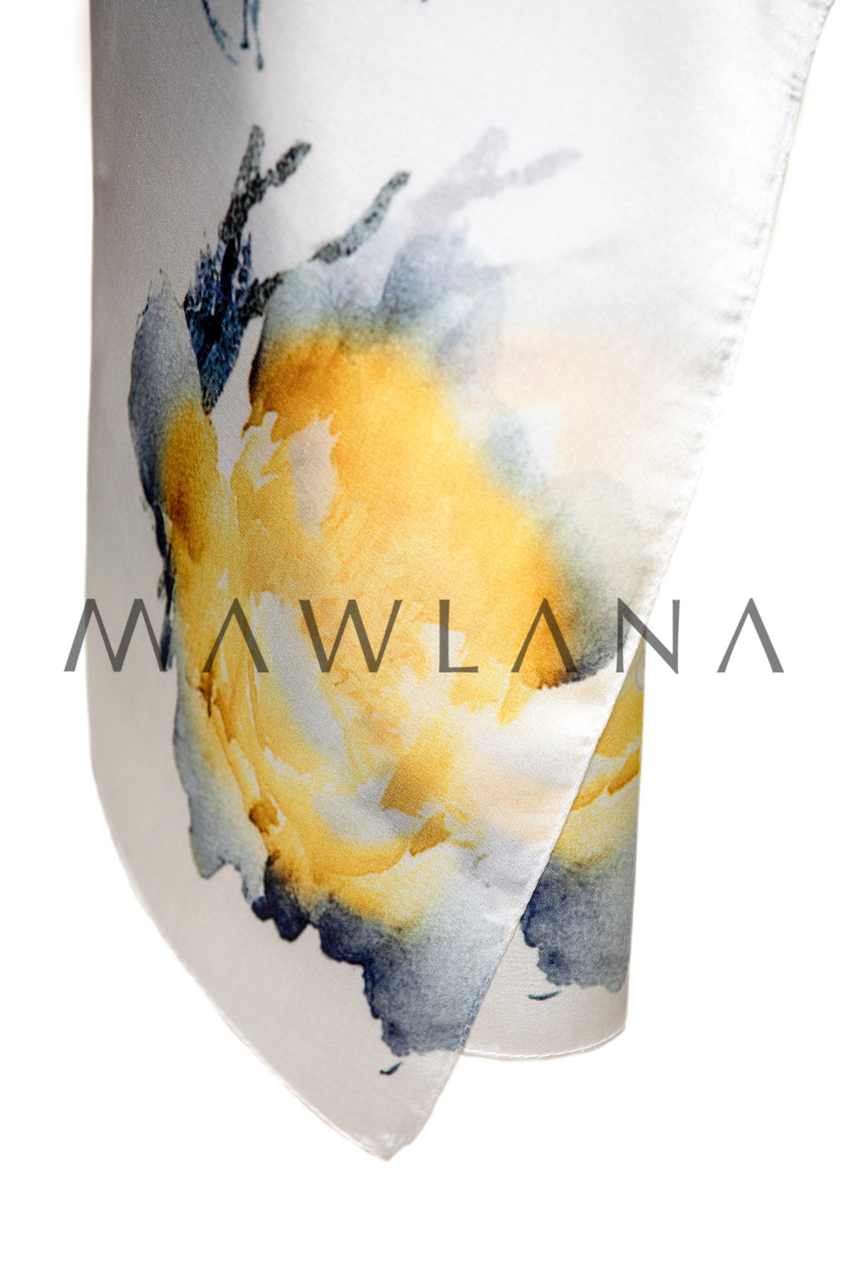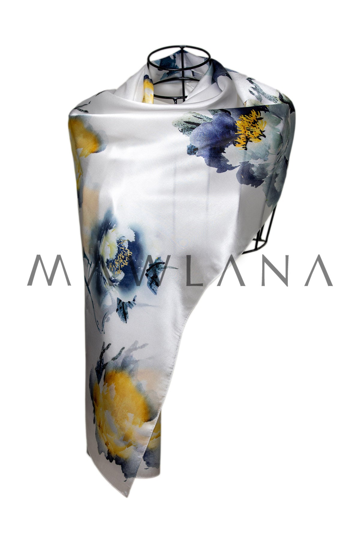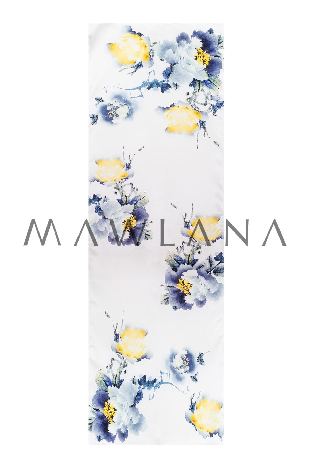 This luxurious scarf, crafted from 100% pure silk and measuring 53 × 173 cm, combines delicate softness with artistic elegance. The pearly white base is adorned with watercolor-style floral blooms in vibrant yellow and rich indigo tones.