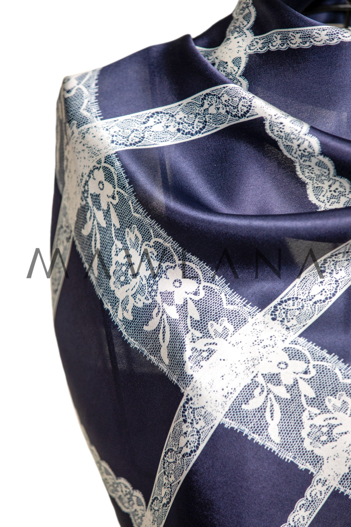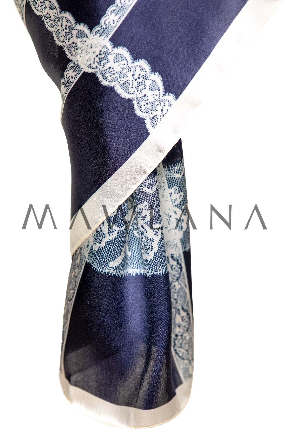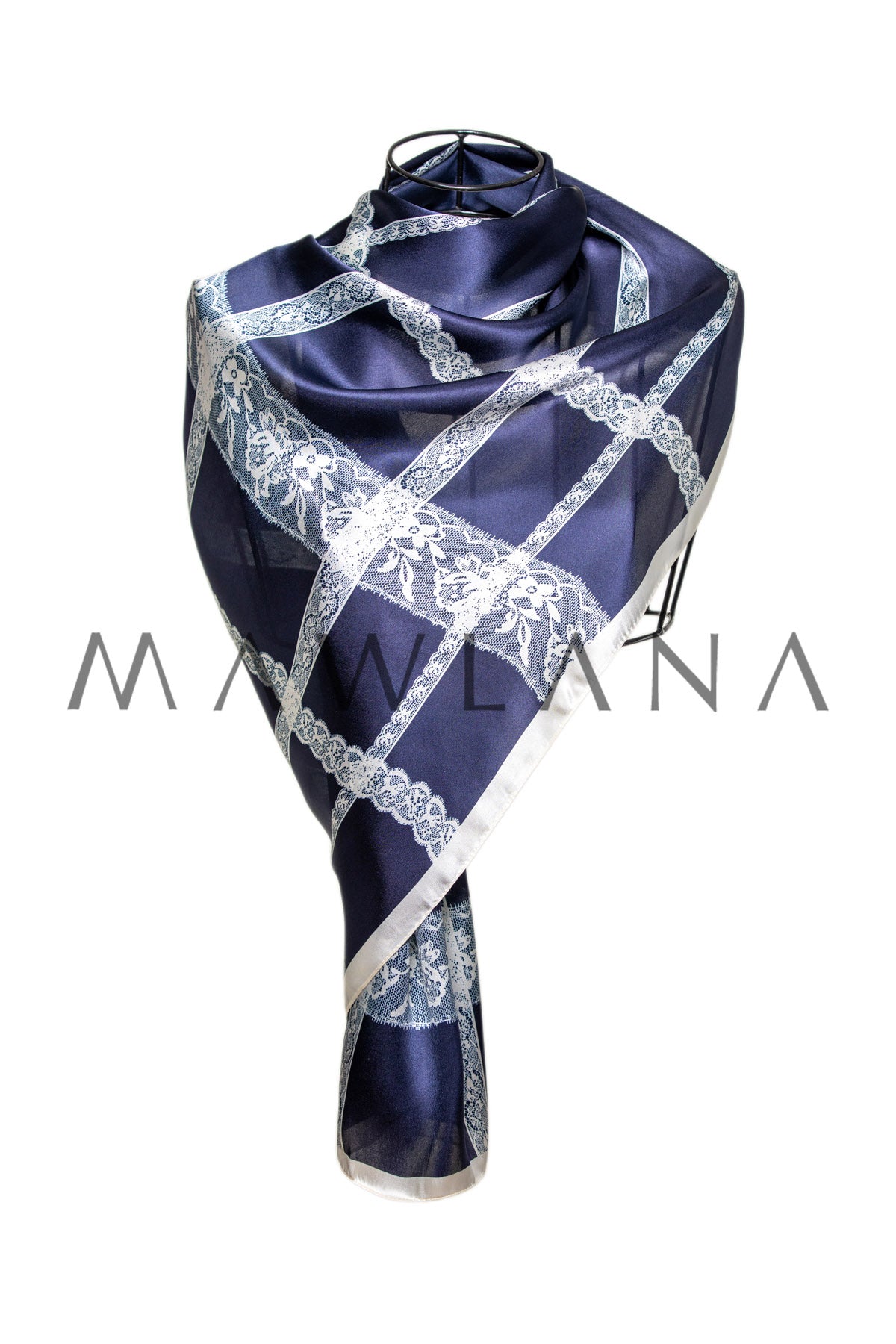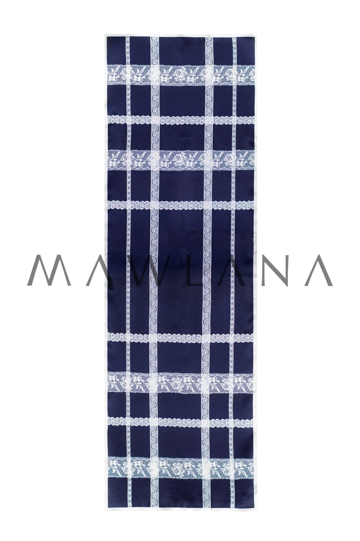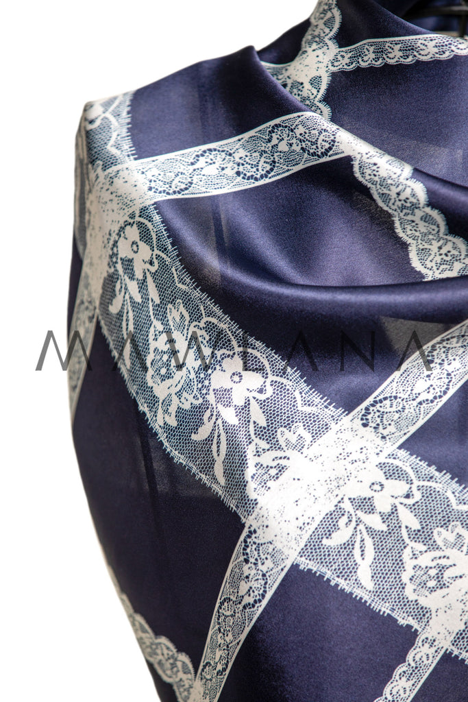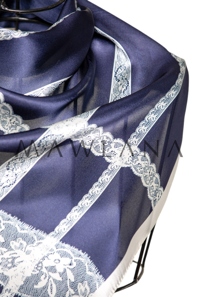 A luxurious shawl made of 100% pure silk, measuring 53 × 170 cm. It features a rich navy-blue background intersected with delicate white lace-patterned lines, creating a refined and balanced look of elegance and boldness.