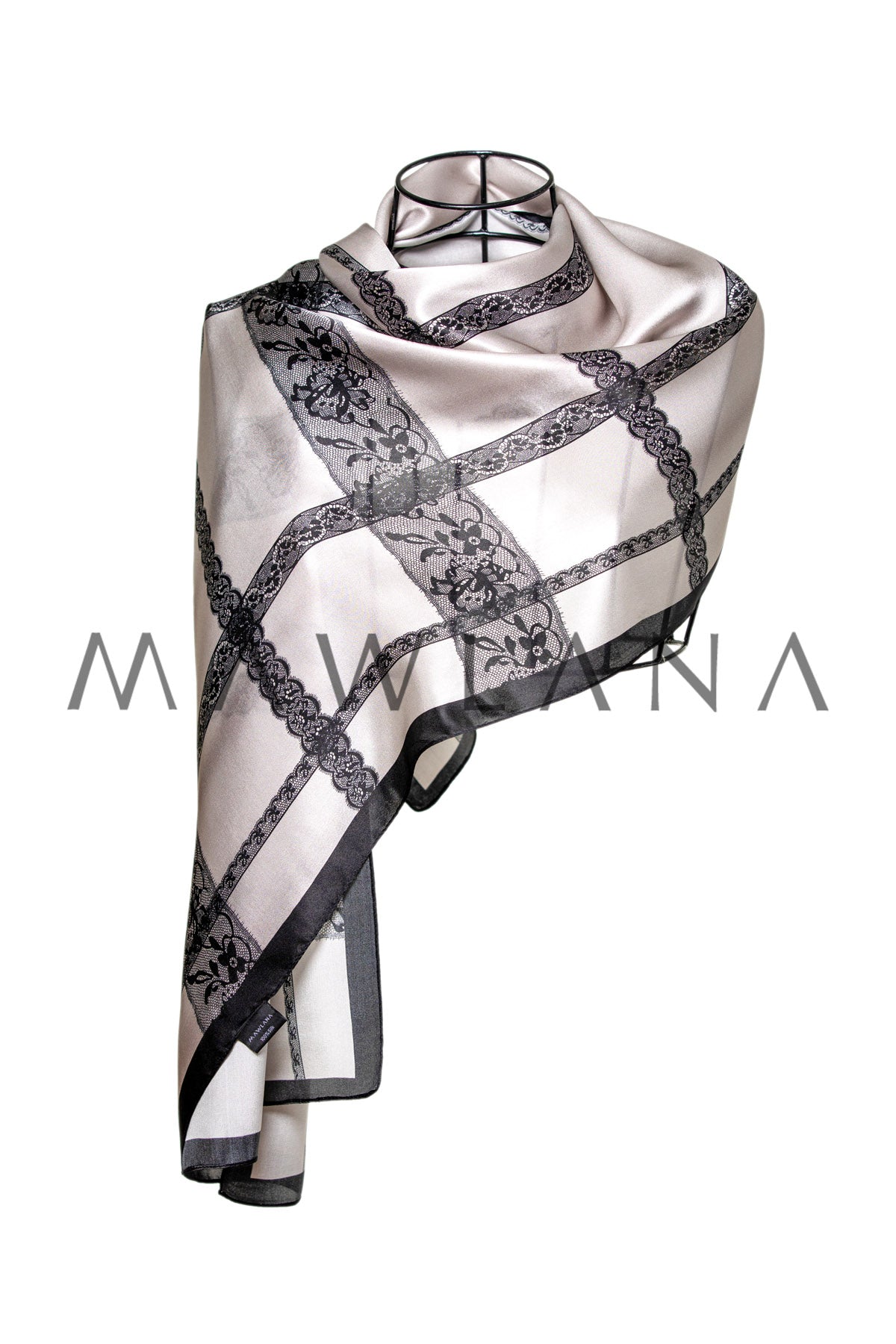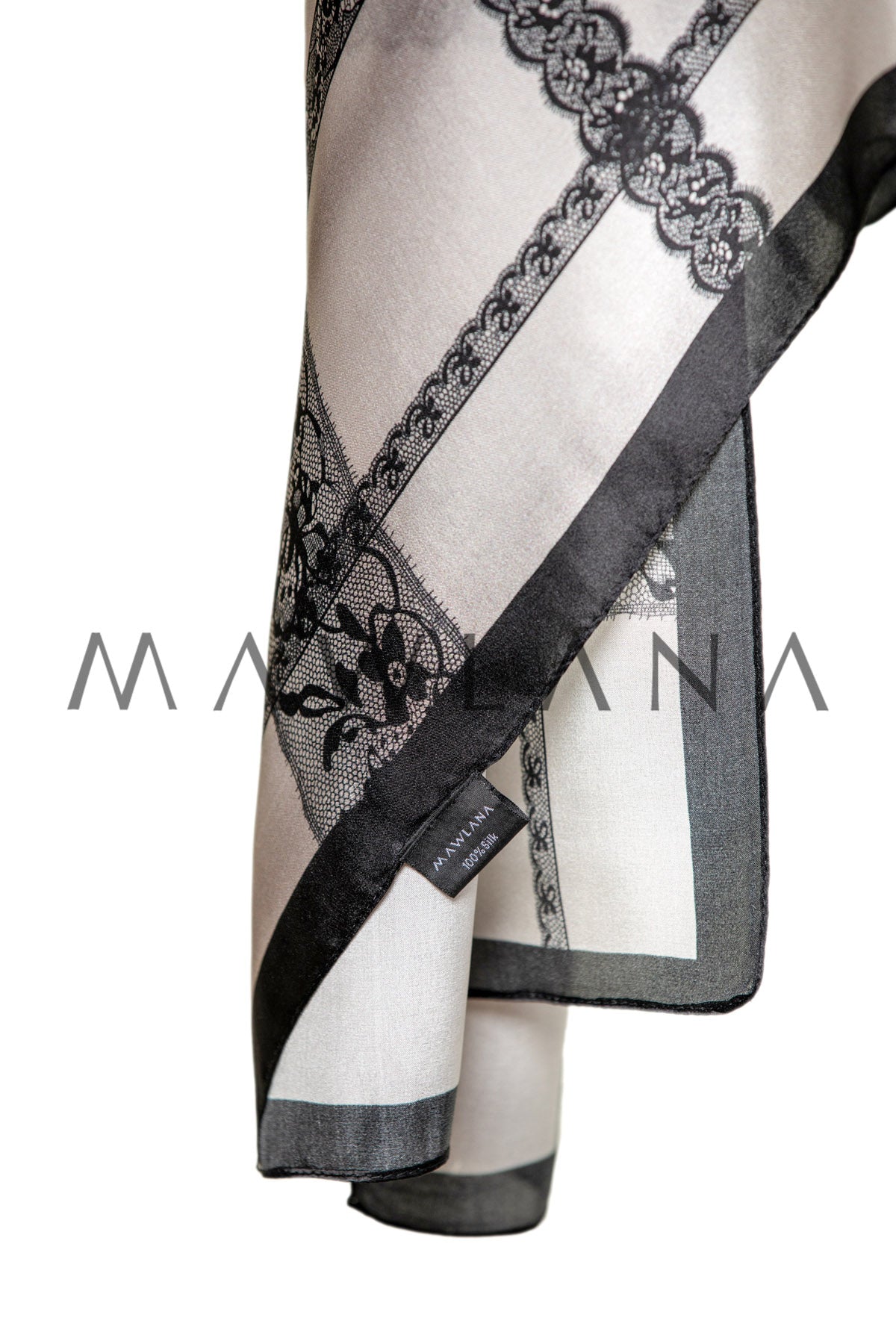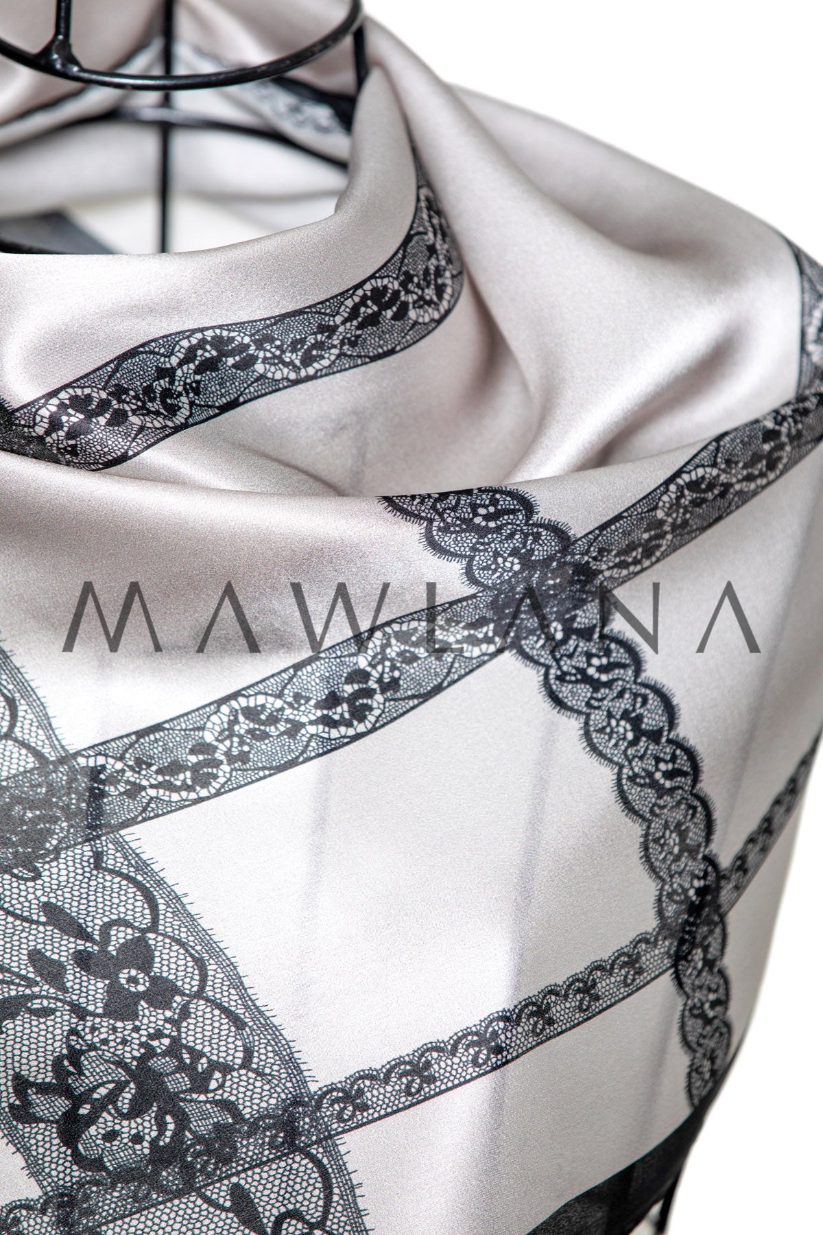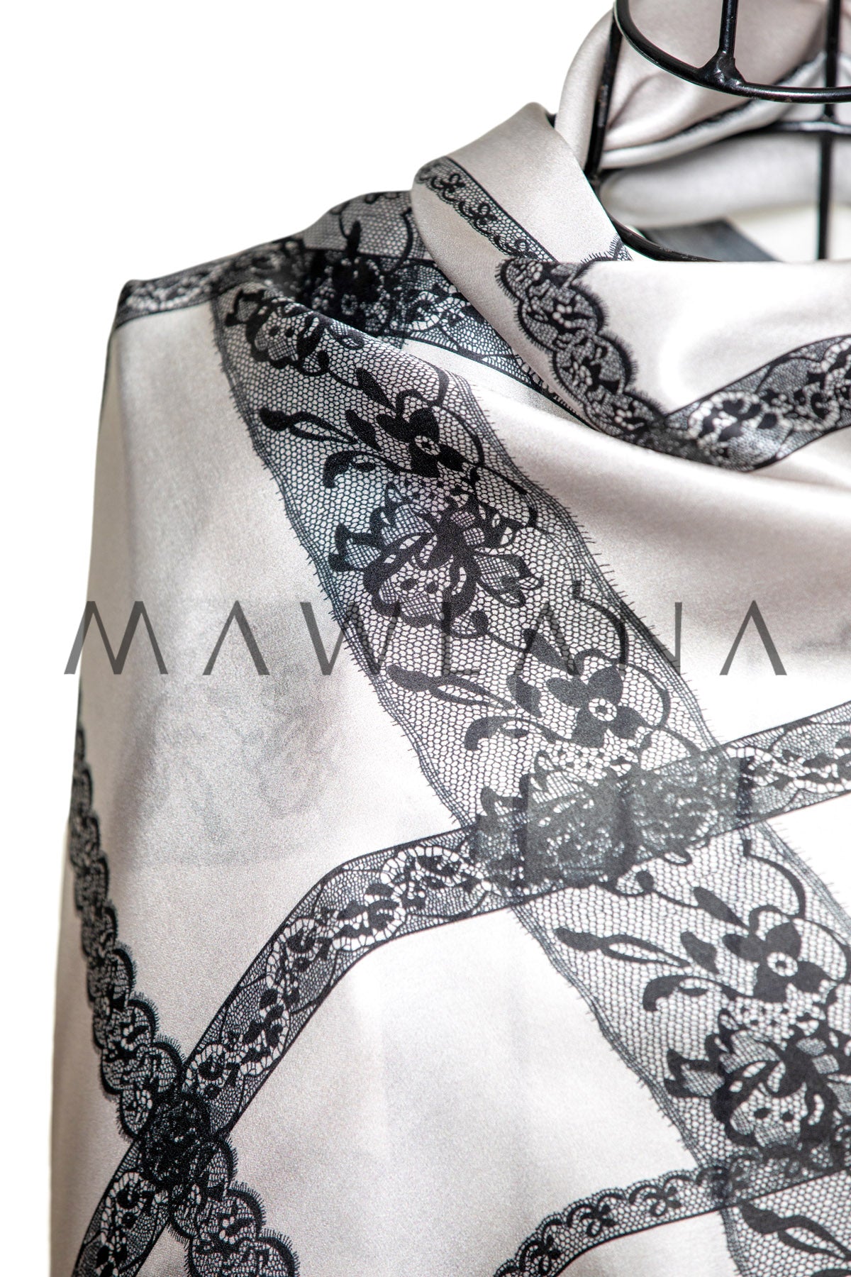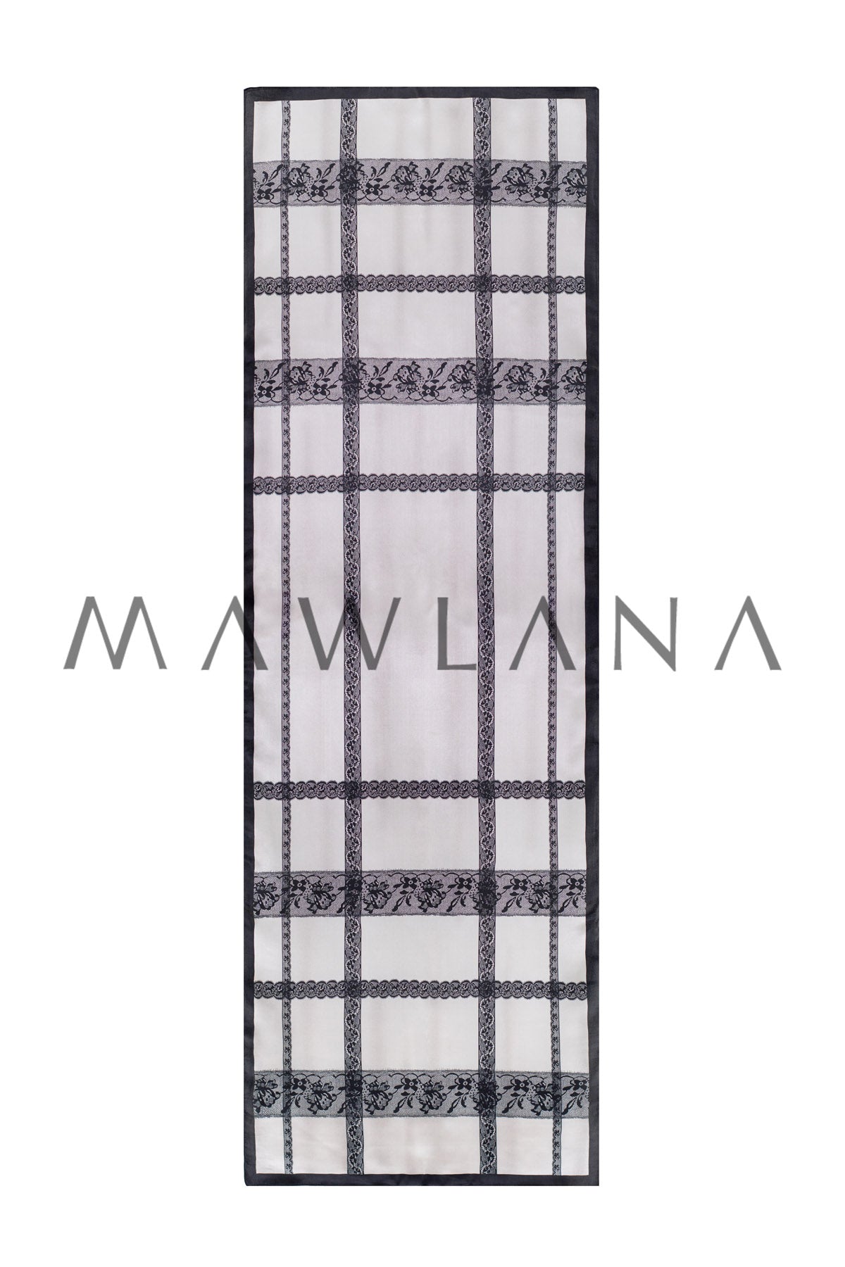 Elegant shawl made of 100% pure silk, measuring 53 × 170 cm. Featuring a classic white background adorned with a grid of luxurious black lace, this design blends artistic flair with geometric sophistication, combining tradition and modernity.