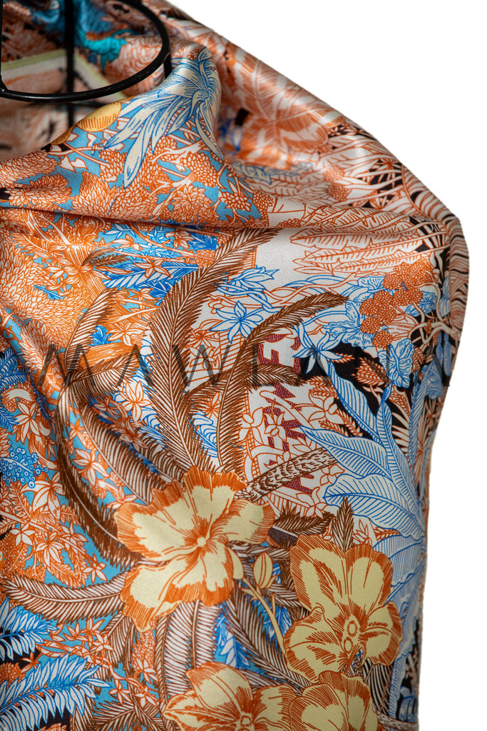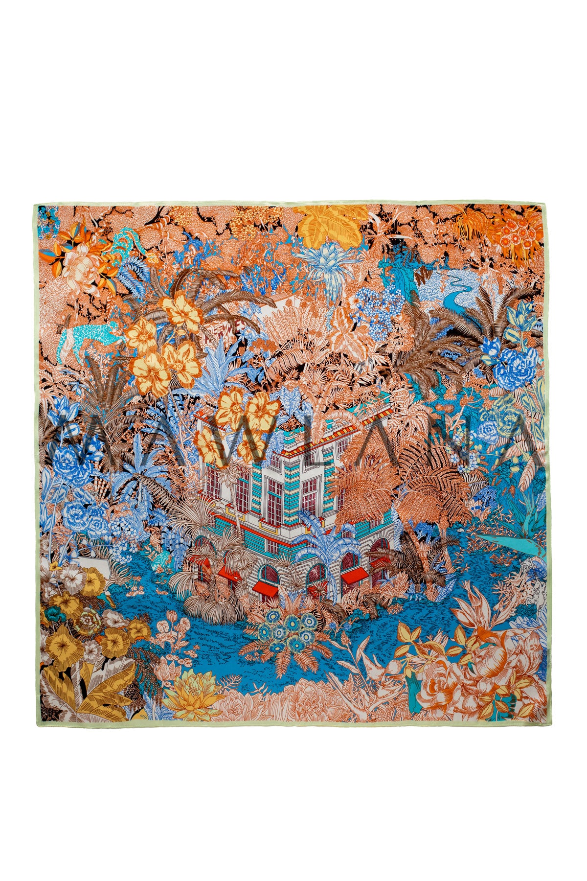 Its pattern is inspired by the enchanting beauty of nature. A classic pavilion surrounded by vibrant tropical flowers and leaves adds an artistic touch to the design. The harmony of royal blue, orange, gold and brown tones offers a sophisticated and elegant look.
