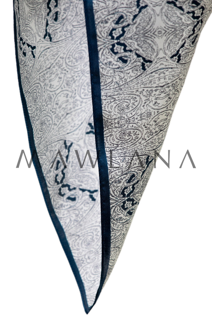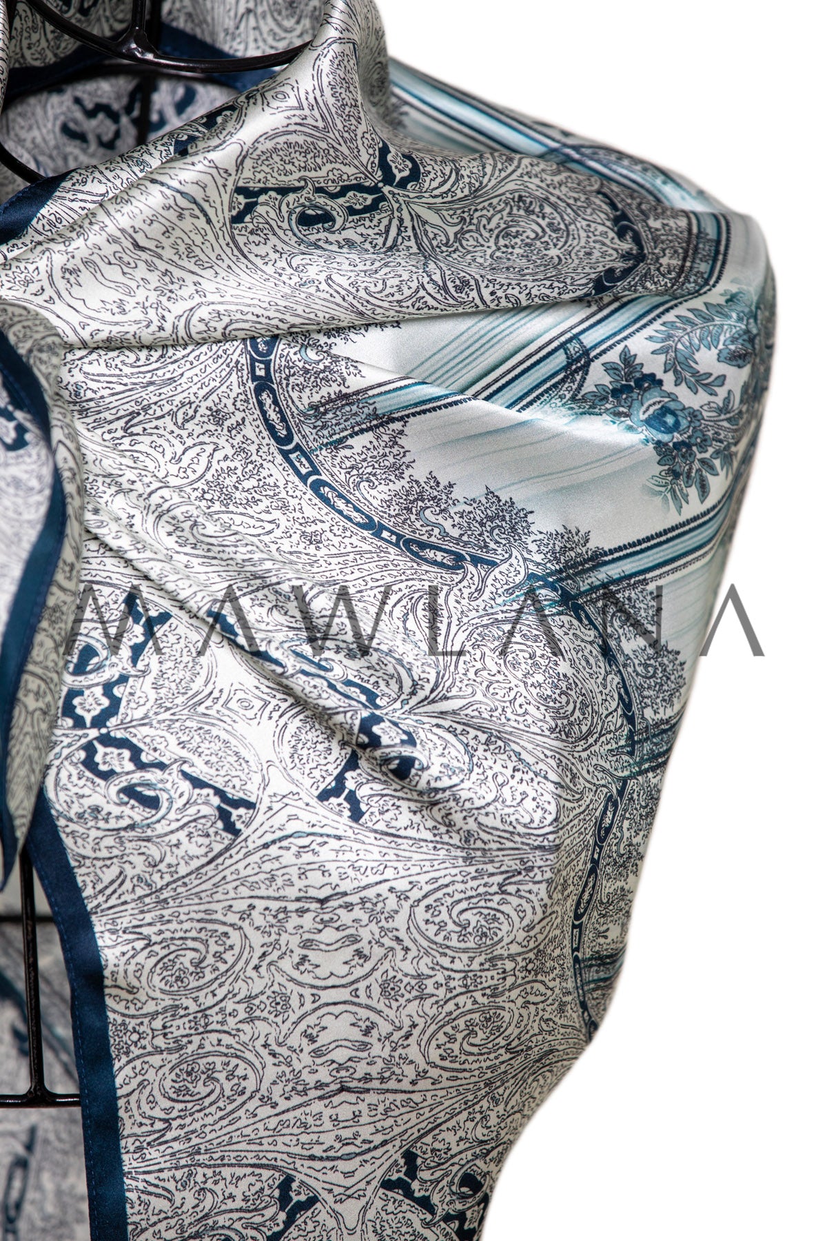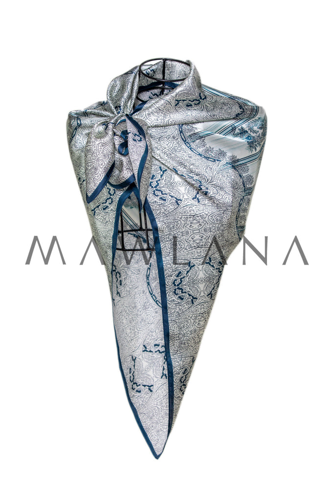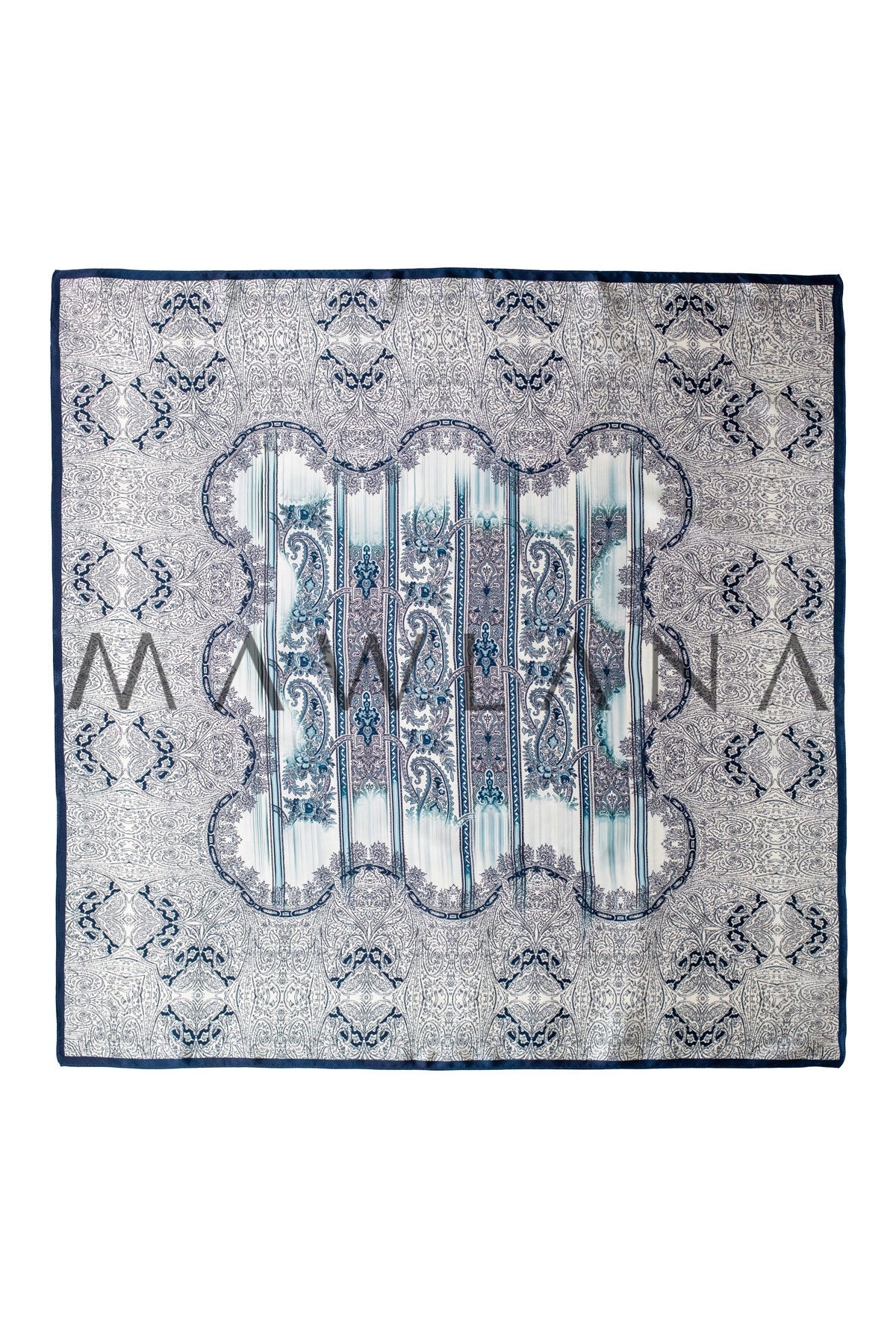 Its pattern is inspired by classical art and architectural ornaments. Elegant motifs and geometric details, combined with oriental-inspired ornaments, give the shawl an elegant and noble appearance. The harmony of navy blue, turquoise and beige tones adds a classic and sophisticated air.
