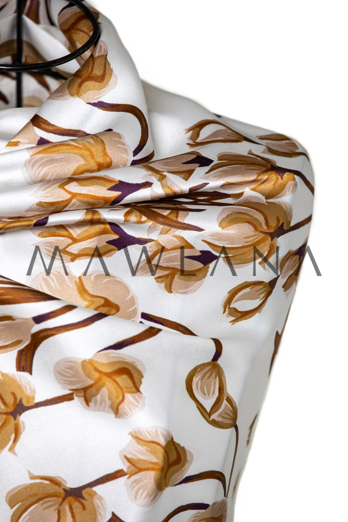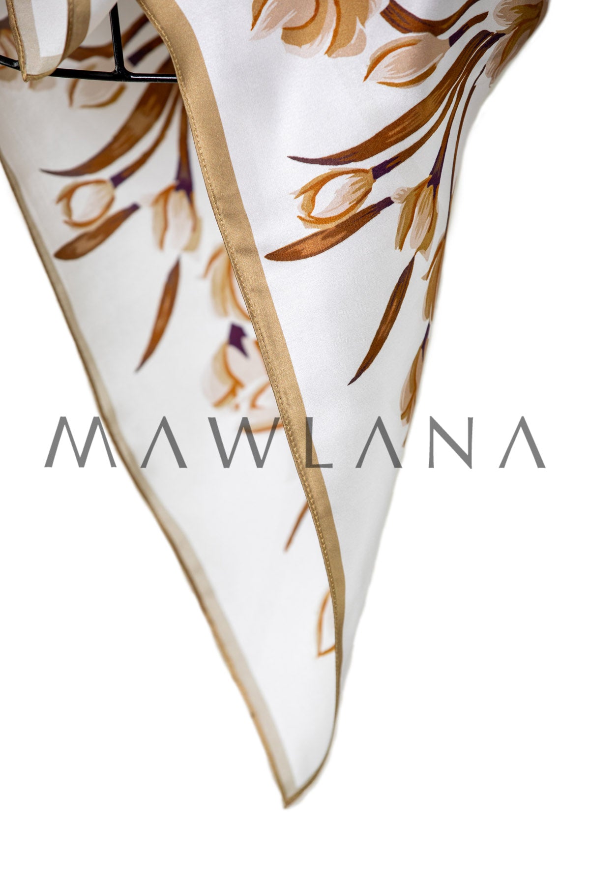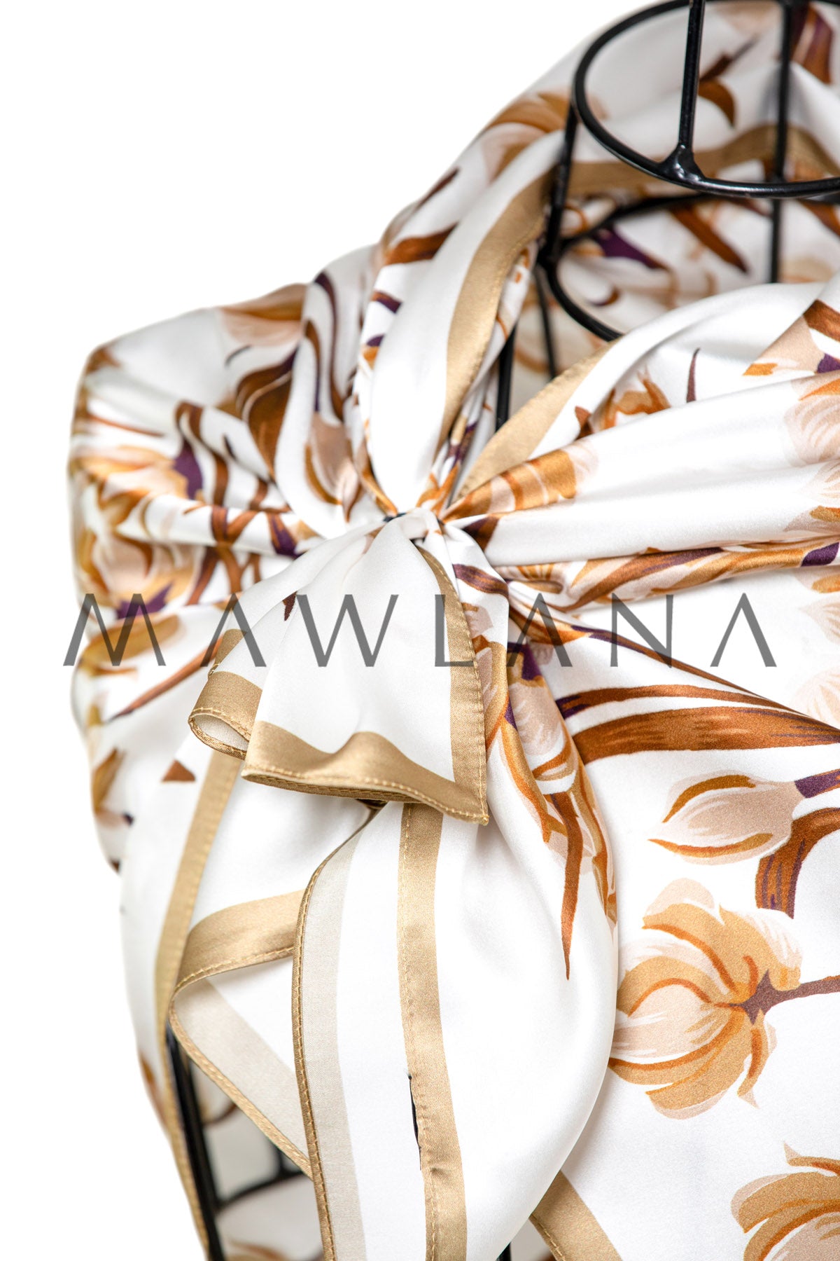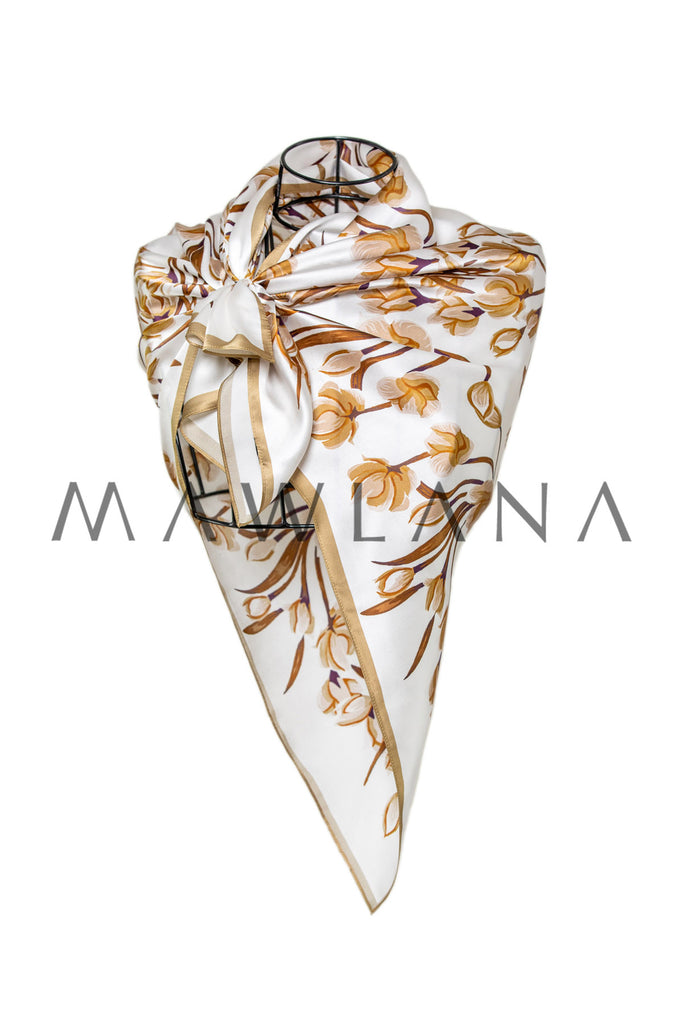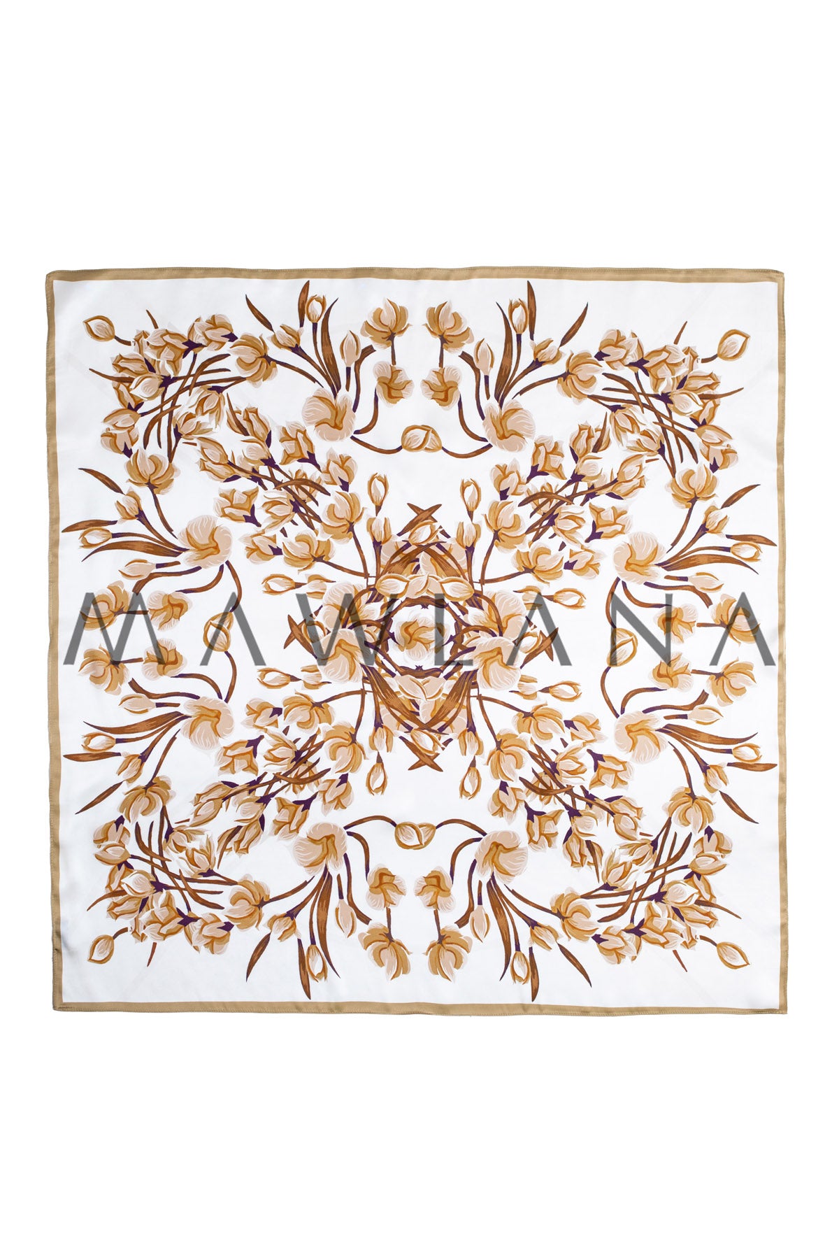 A luxurious square scarf made of 100% pure silk, measuring 90 × 90 cm. It features a pure white background adorned with an intricate design of intertwined cotton branches and blossoms in beige and golden tones, creating a harmonious and symmetrical composition. Touches of deep violet add visual depth, while a light beige border frames the design with refined elegance.