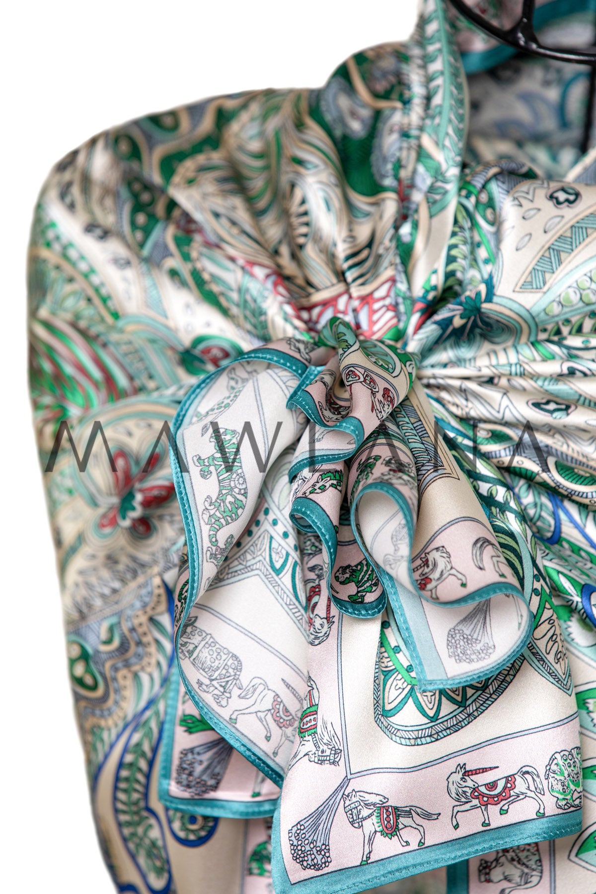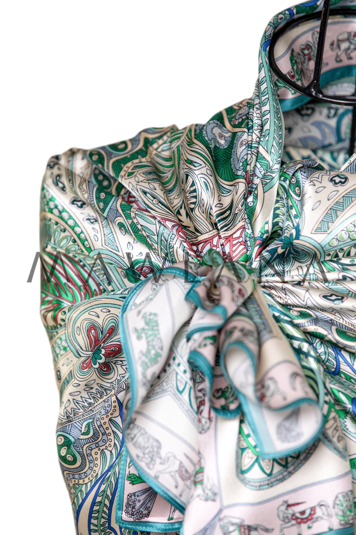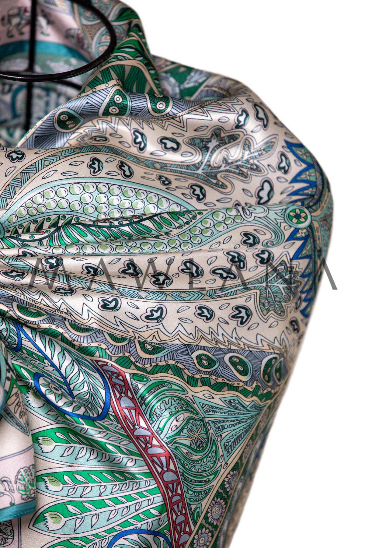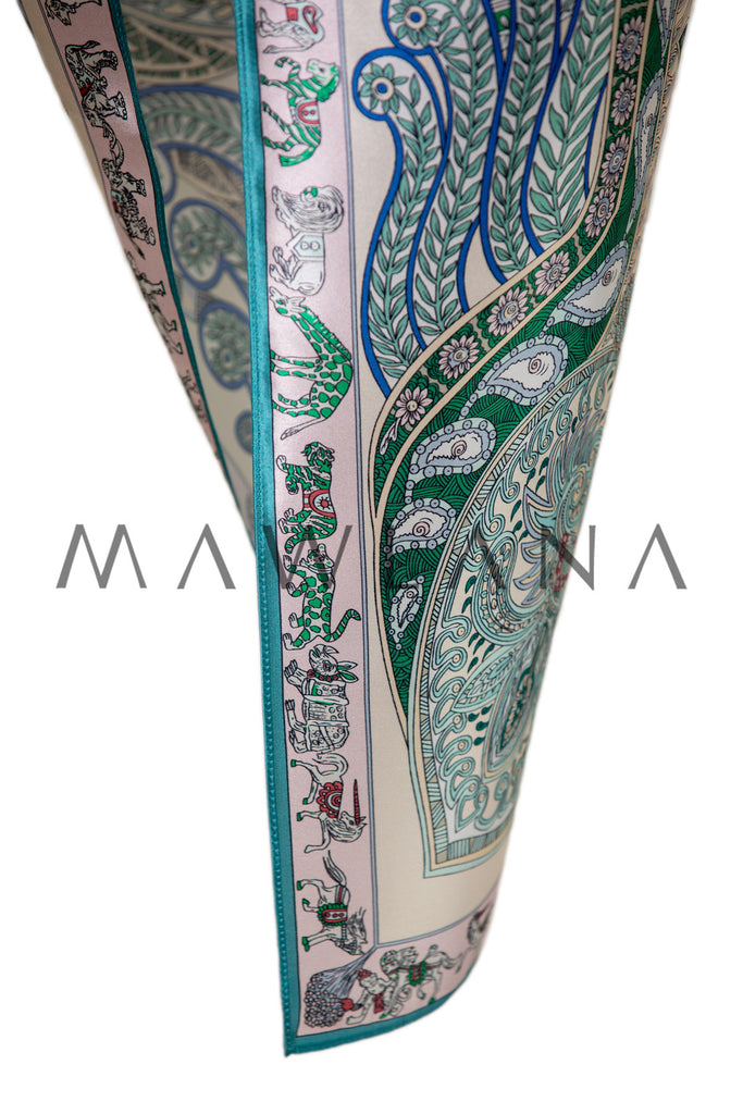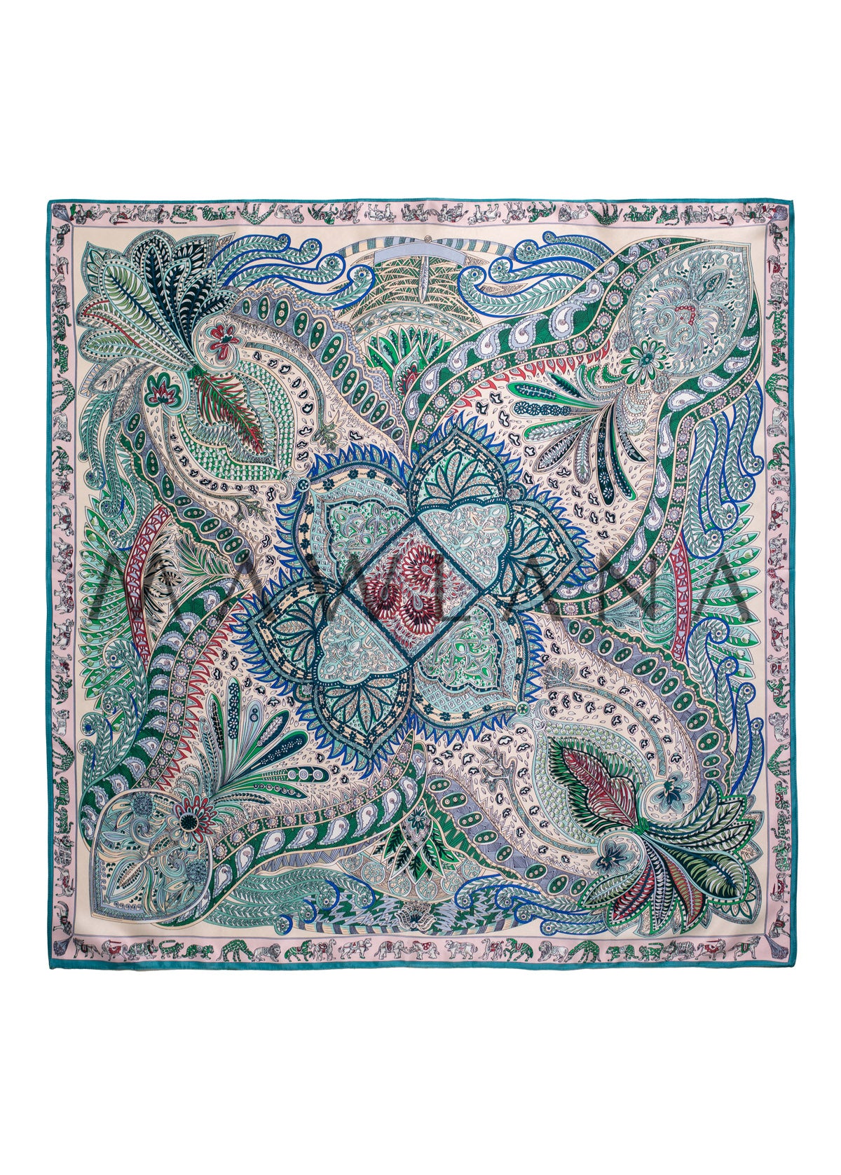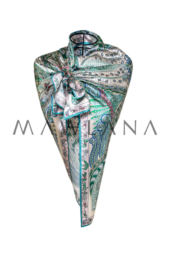 A luxurious square scarf made of 100% pure silk, measuring 90 × 90 cm. It showcases a rich bohemian design inspired by classic paisley art, featuring intricate patterns and botanical motifs in shades of green, blue, and red over a soft beige background. The fine details form a vibrant ornamental composition, bordered by a decorative frame with motifs drawn from nature and Eastern culture.