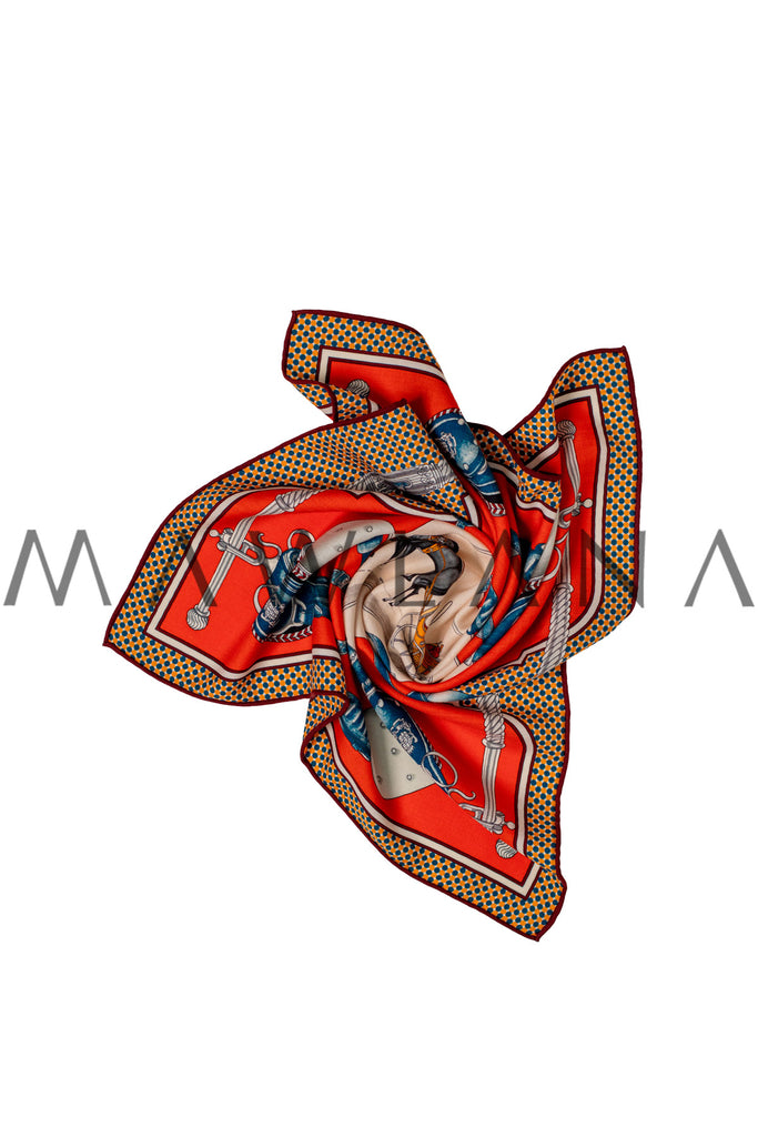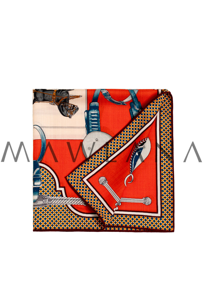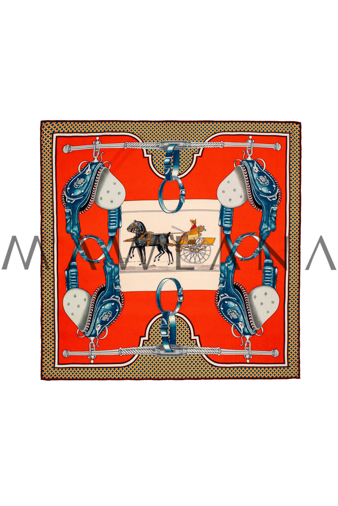 Embrace timeless elegance with this bold and vibrant scarf inspired by equestrian heritage. Featuring a striking orange background, the design centers around a traditional horse-drawn carriage scene, surrounded by detailed illustrations of saddles, bridles, and reins in rich shades of blue and white.