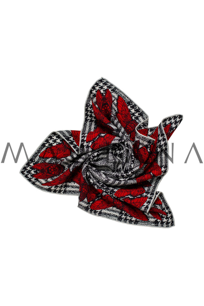 Bold and graphic, this eye-catching scarf combines a timeless black-and-white houndstooth pattern with vivid red butterflies arranged around the edges. The contrast between classic and contemporary makes this piece a standout accessory for any season.