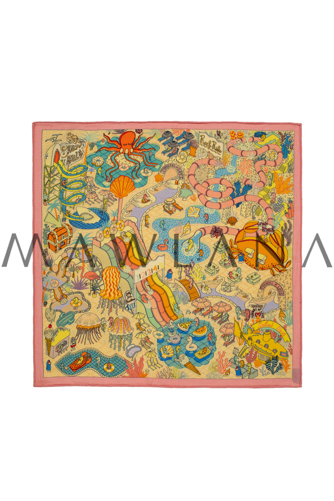Dive into fun with this cheerful and imaginative scarf inspired by a whimsical waterpark adventure. Featuring colorful slides, sea creatures, swimmers, and charming little details like pizza floats and submarines, this design is bursting with joy and creativity, all set against a warm pastel background with a soft pink border.