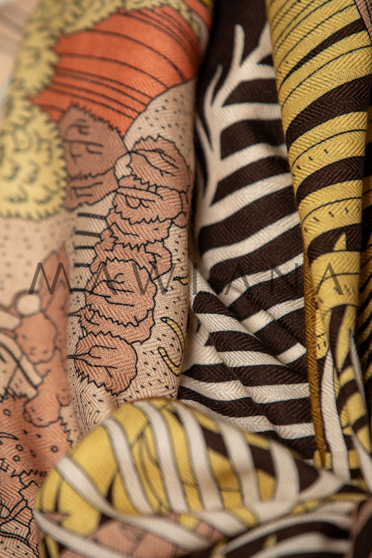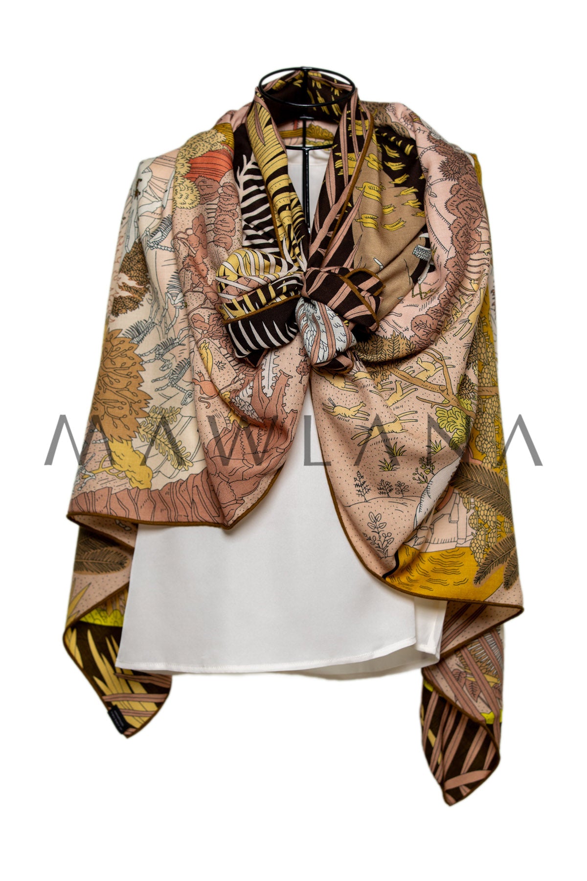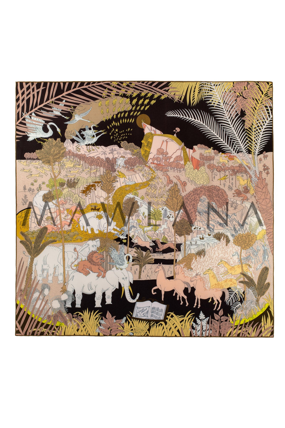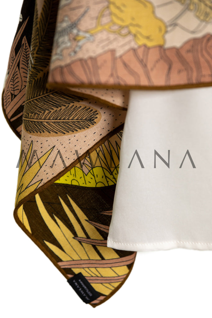 This enchanting scarf unfolds like a fairytale on a rich dark canvas—galloping horses, swirling dragons, ancient books left open on the grass, and fantastical cities rising behind golden hills. Every detail invites you to dive deeper, discovering a new part of the story with each glance.