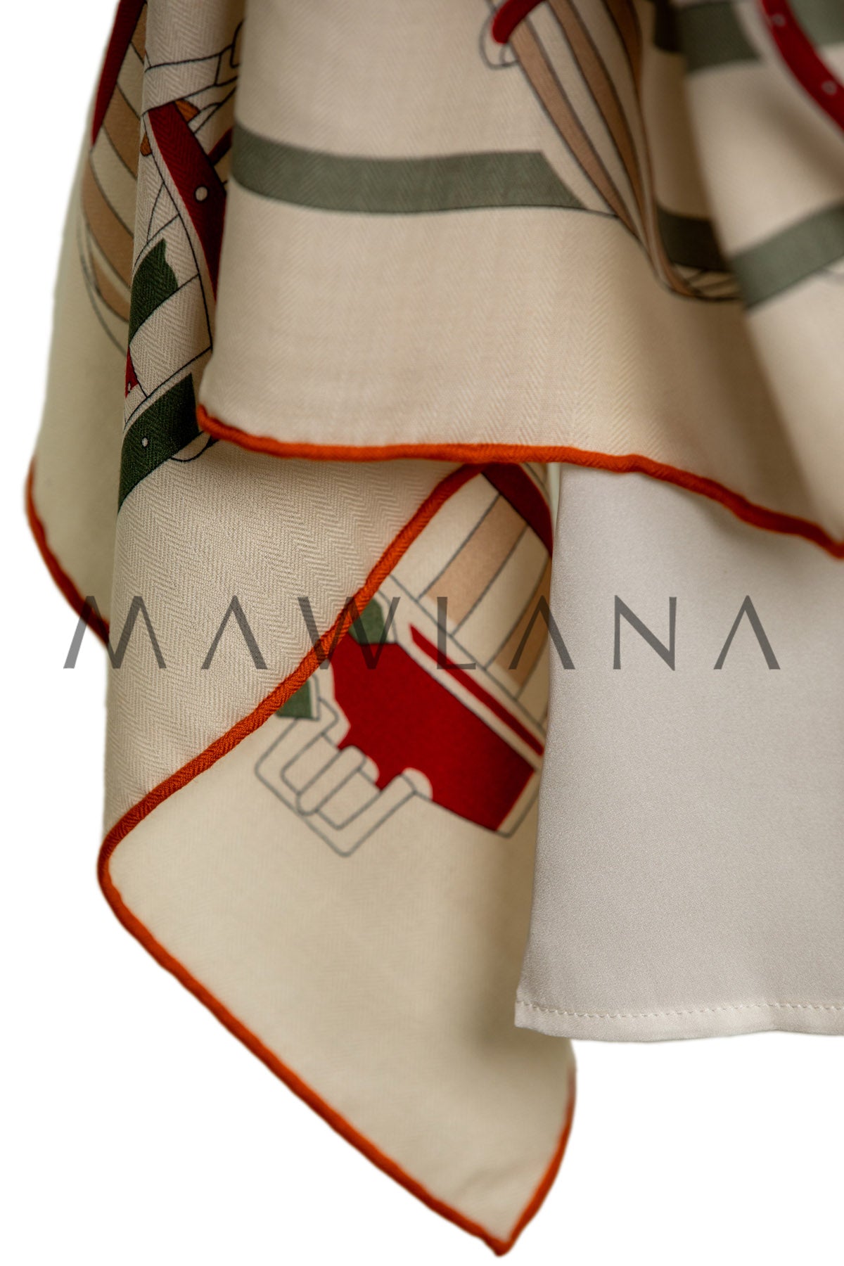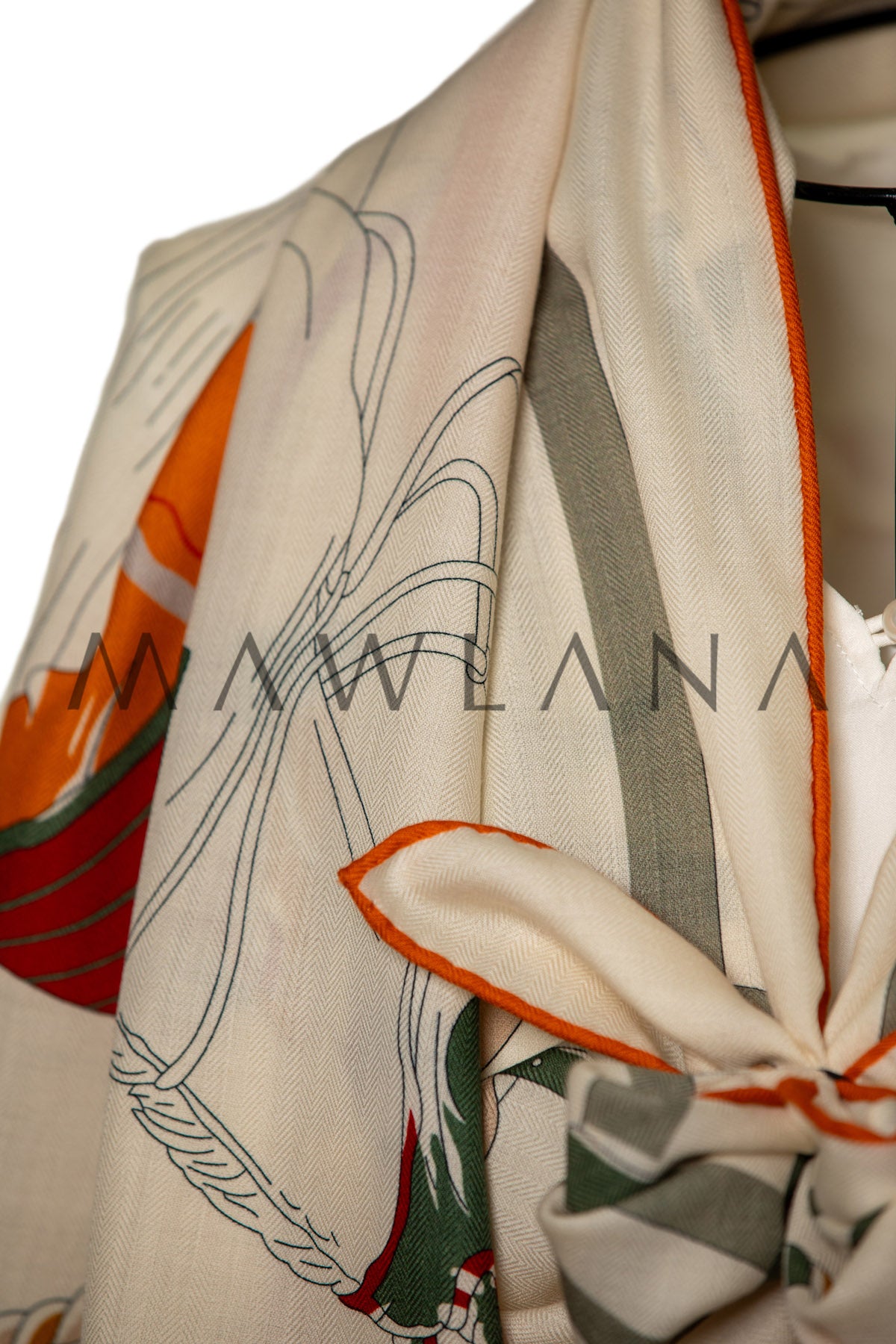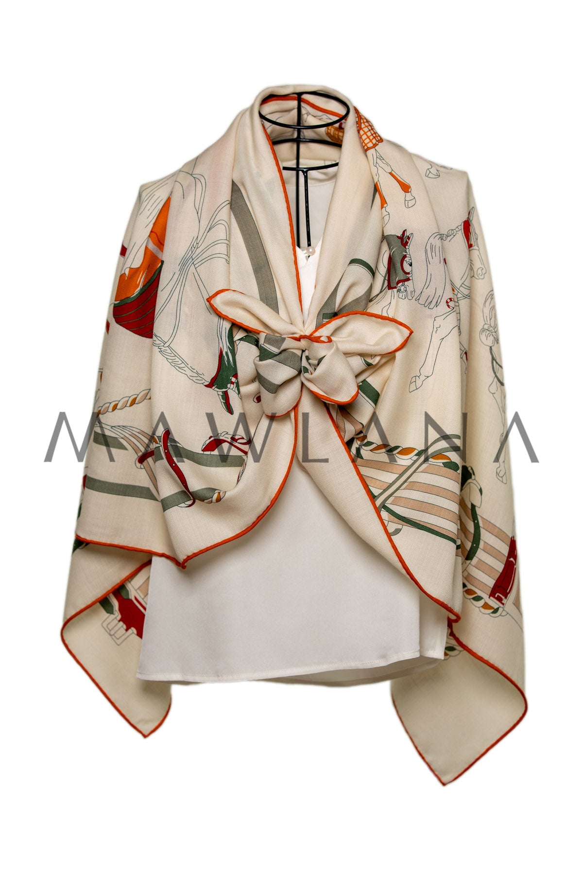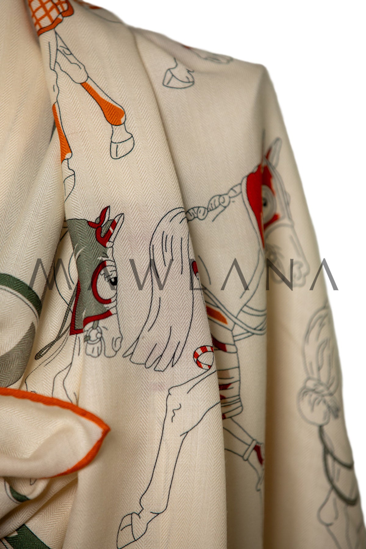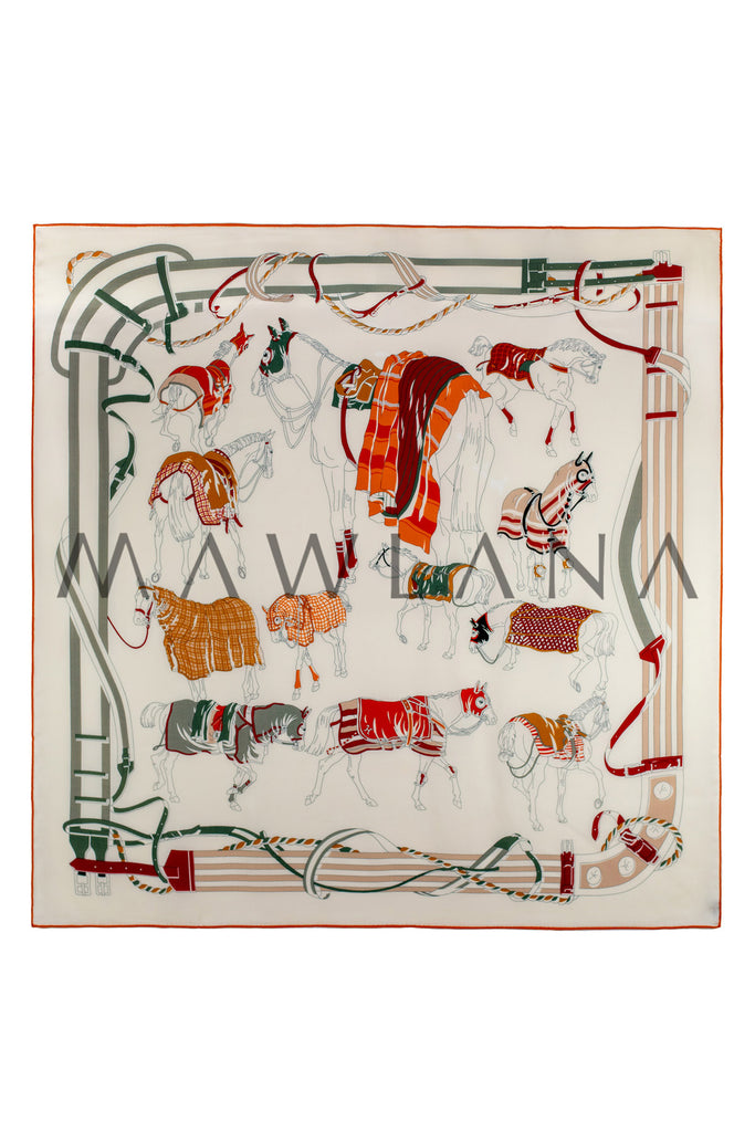 A celebration of equestrian elegance, this scarf showcases a delightful array of horses draped in beautifully patterned blankets. Each one is illustrated with precision and charm—wrapped in checks, stripes, and quilted textures in rich shades of red, orange, ochre, and green.