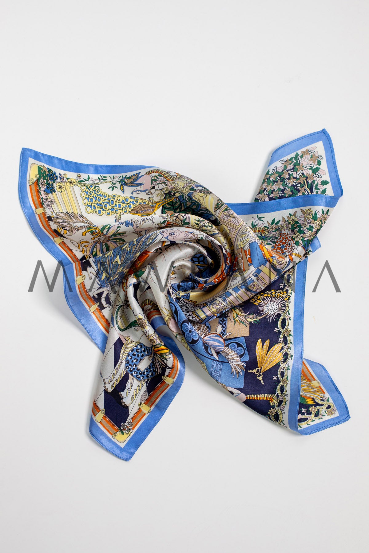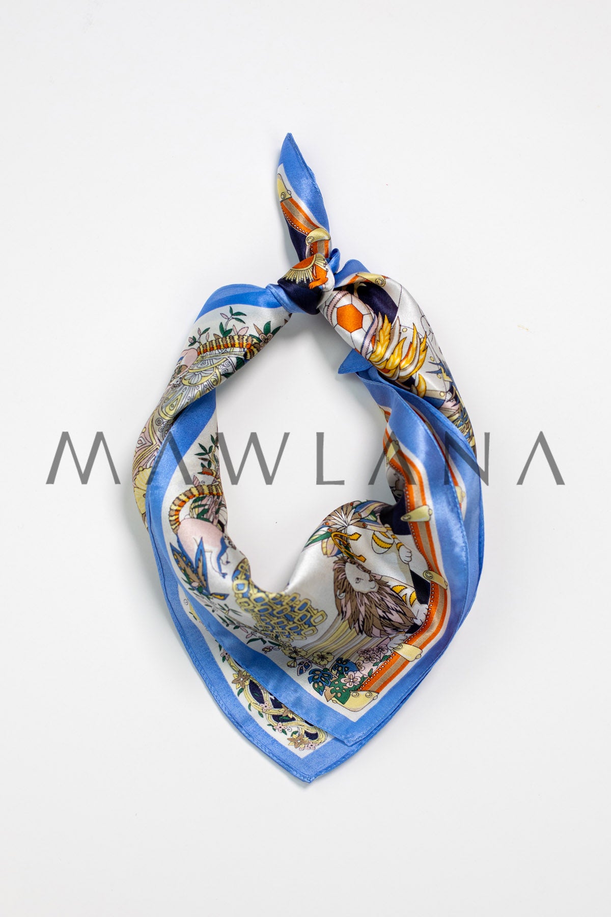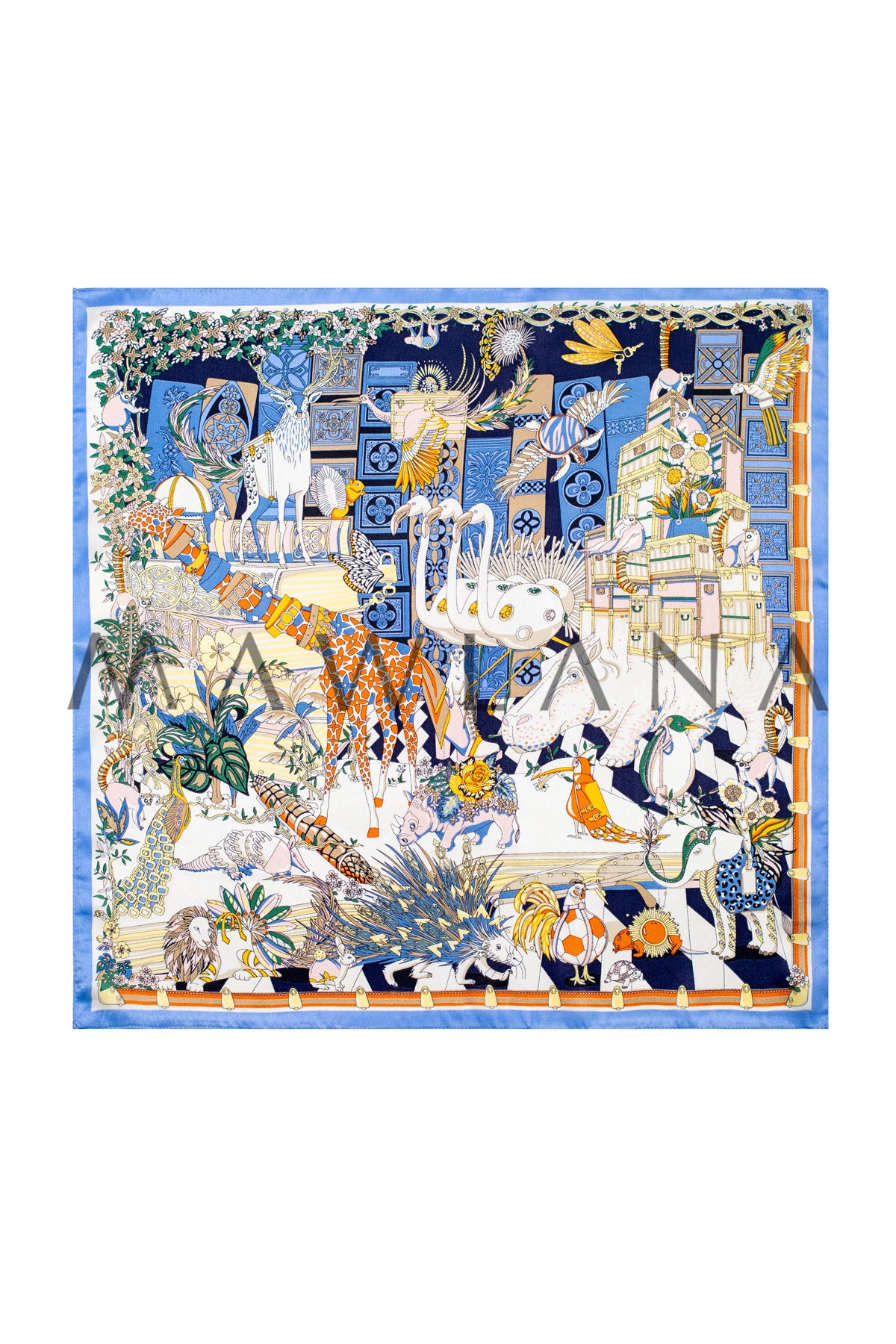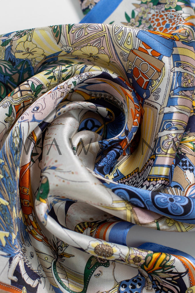 This scarf is a whimsical journey into a vibrant kingdom where exotic animals and enchanting nature meet in perfect harmony. From the jewel-patterned giraffe to the radiant peacock and the contemplative lion, each creature is illustrated with storytelling precision. Shades of blue, orange, and gold dance over a crisp white base framed in soft blue.