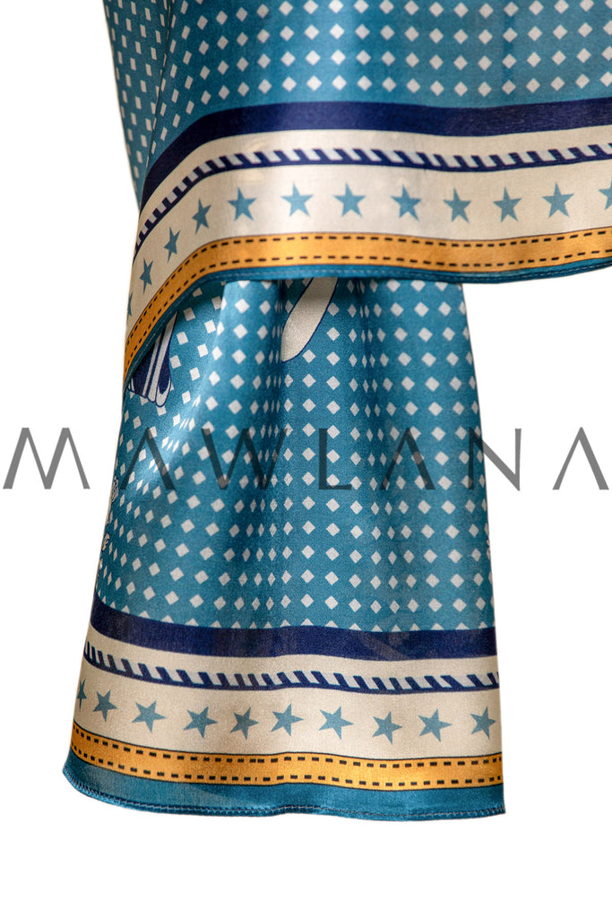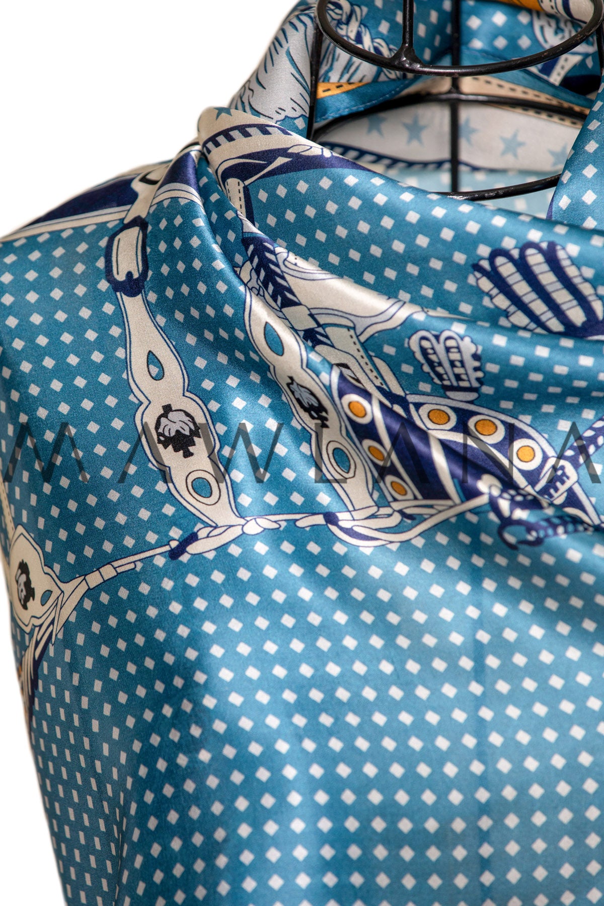 The design is inspired by the world of luxury equestrianism. Bridles, saddles, and metal chain details add a sense of strength and sophistication to the scarf. The dotted blue background blends classic and modern styles, while the golden frame and elegant embellishments provide a refined touch. The combination of deep blue, white, and golden yellow creates a sophisticated and stylish look.